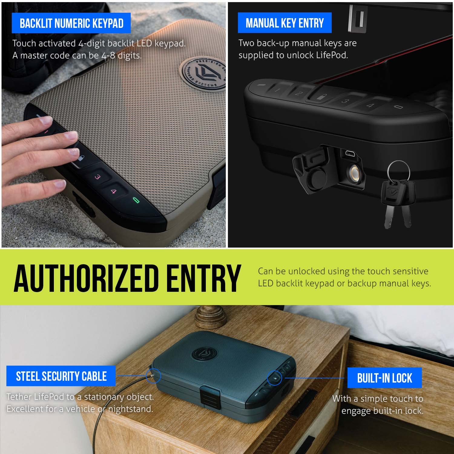 - BUILT-IN LOCK SYSTEM uses precision engineered safe technology and anti-impact latch design. LifePod 2.0 can be unlocked using the touch sensitive LED backlit keypad or backup manual keys. To lock LifePod simply press and hold the lock pad to engage the internal locking mechanism. An optional anti-picking feature can be enabled to prevent picking of the front keyway.