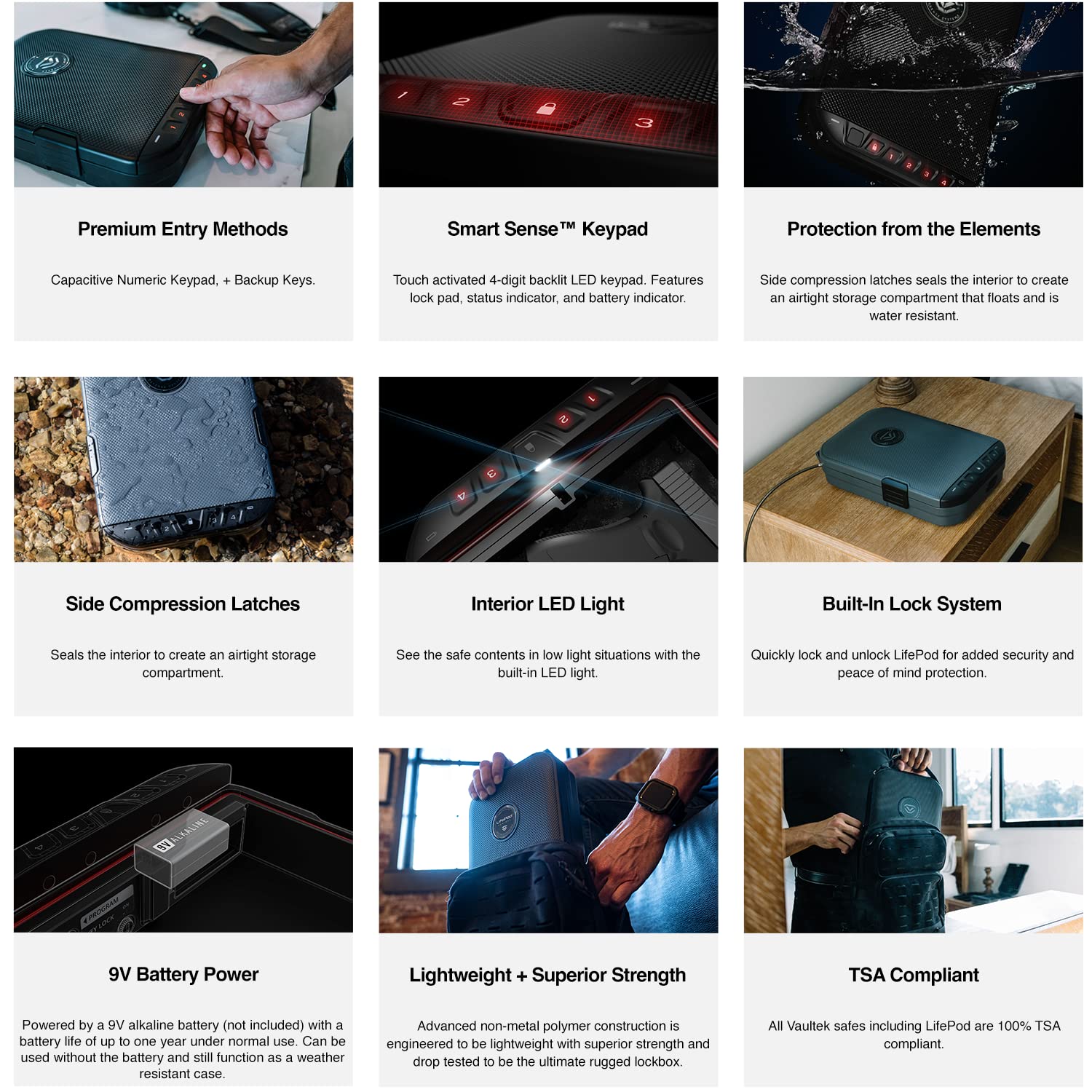 - DESIGNED TO PERFORM. Advanced non-metal polymer construction is engineered to be LIGHTWEIGHT with SUPERIOR STRENGTH and DROP TESTED to be the ultimate rugged lockbox. Side compression latches and inner rubber gasket seal off the interior from environmental factors. LifePod is weather resistant, airtight, dust proof, floats, and is TSA complaint.