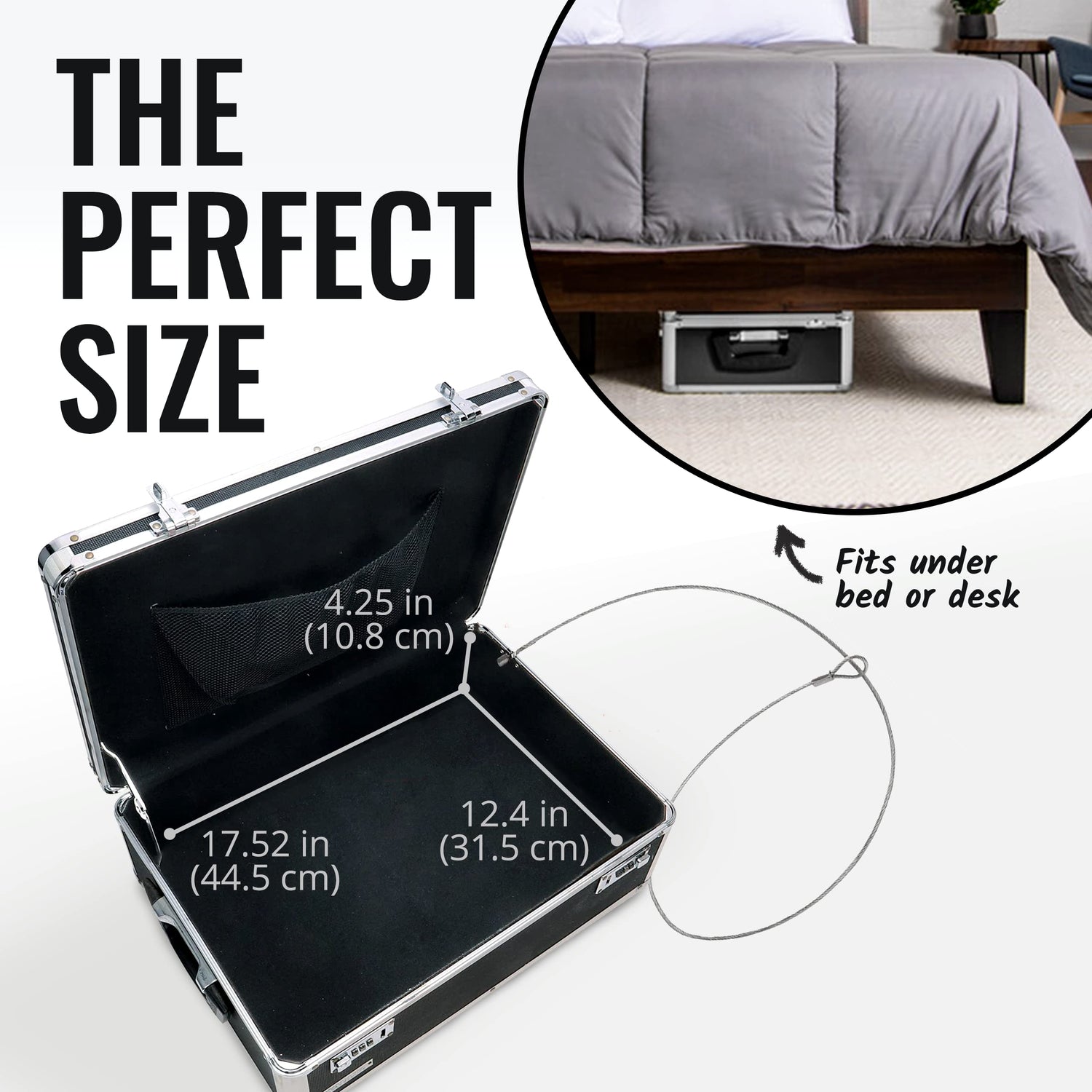 Details: Perfect for protecting your valuables, whether it's your passport, confidential files, documents, computer, cell phone or cash, this storage chest will keep your items secure. Strong construction and a soft interior keep your valuables protected from bumps and scratches while dual combination locks keep them safe from theft. Includes a steel, bolt-down cable for additional security and mesh netting for better interior organization.
