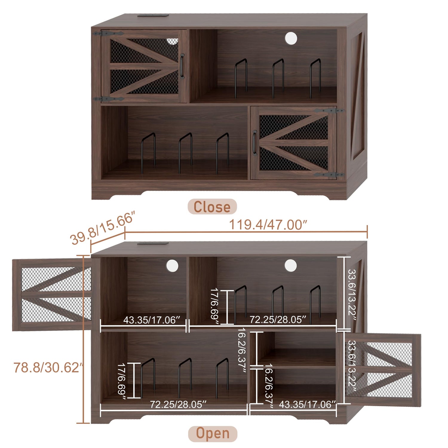 - 【Large Record Player Stand】Measuring 47"W × 15.7"D × 31"H, this oversized record player stand masterfully blends aesthetics and function. It's the ultimate vinyl record player stand with storage, featuring two ventilated mesh barn-door cabinets and open shelves with built-in holders, offering massive storage for 500+ records. The spacious top accommodates virtually any turntable on the market