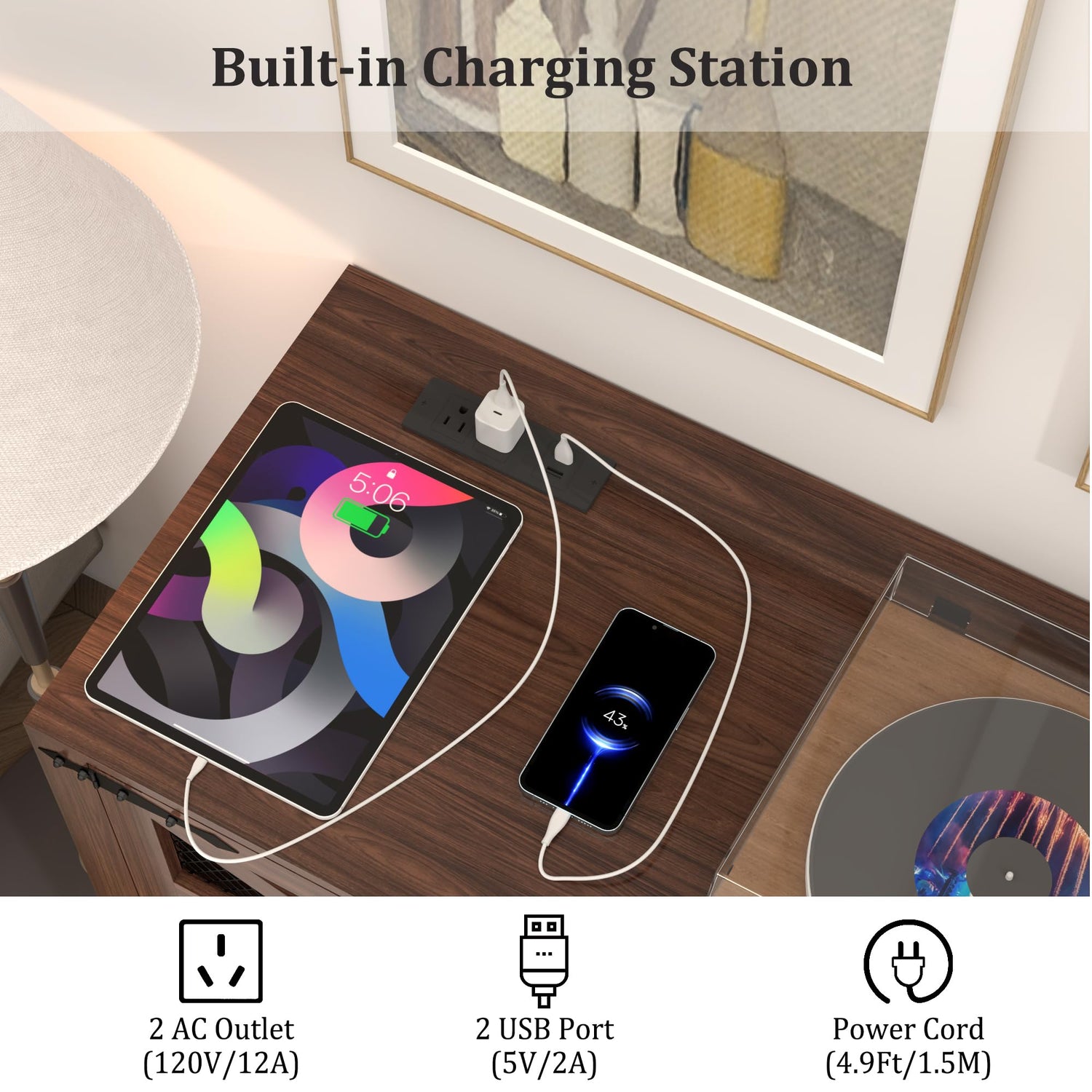 - 【Record Player Stand with Power Outlet】Power your entire setup effortlessly! This wooden record player table is designed with a built-in charging station, including a 4.9ft cord for flexible placement, 2 USB ports and 2 standard outlet for easy access to audio system, record player, but it also allows for easy charging of mobile phones, tablet, etc.