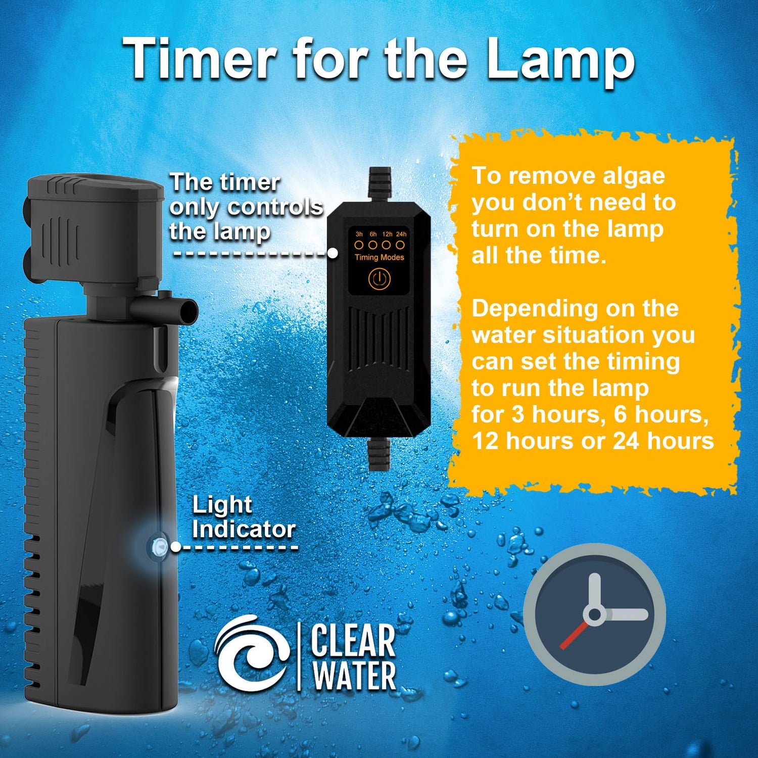 - U - V LIGHT WITH TIMER - The aquarium filter comes with a 5W U - V light, dedicated to maintaining the cleanliness of the water in your tank. It also features a timer that offers 3/6/12/24 hour intervals, enabling you to schedule varying operation times based on your needs. Please note that the timer solely controls the light and not the pump.