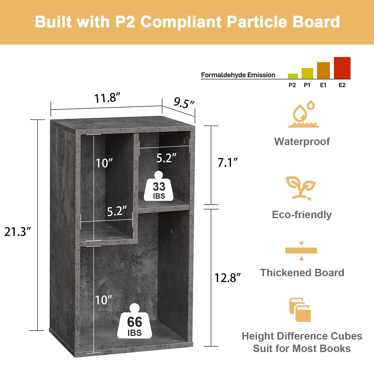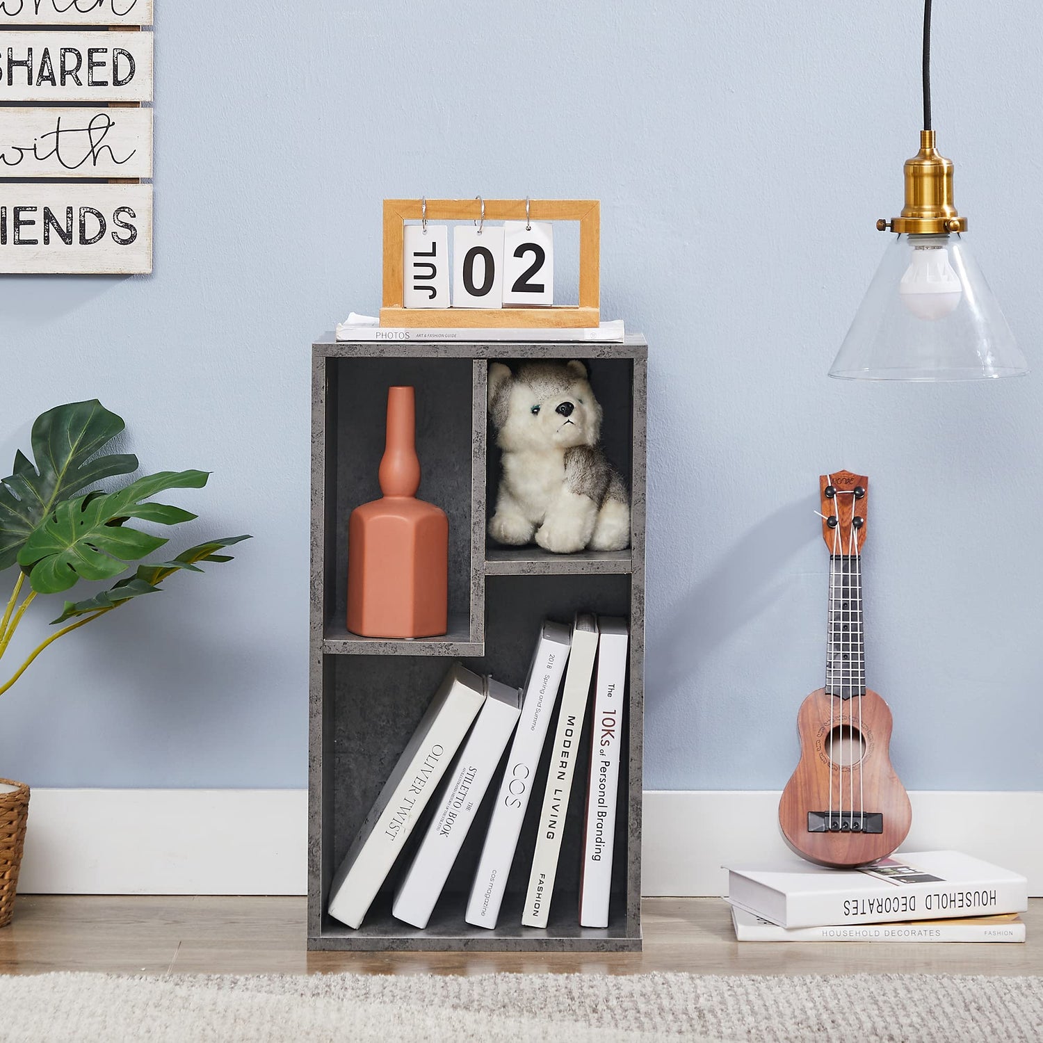 VECELO 3-Cube Open Bookcase, Small Bookshelf with Height Difference Shelves for Most Books, Horizontal Available, 2-Tier Storage Organizer for Home Office, Living Room, Grey