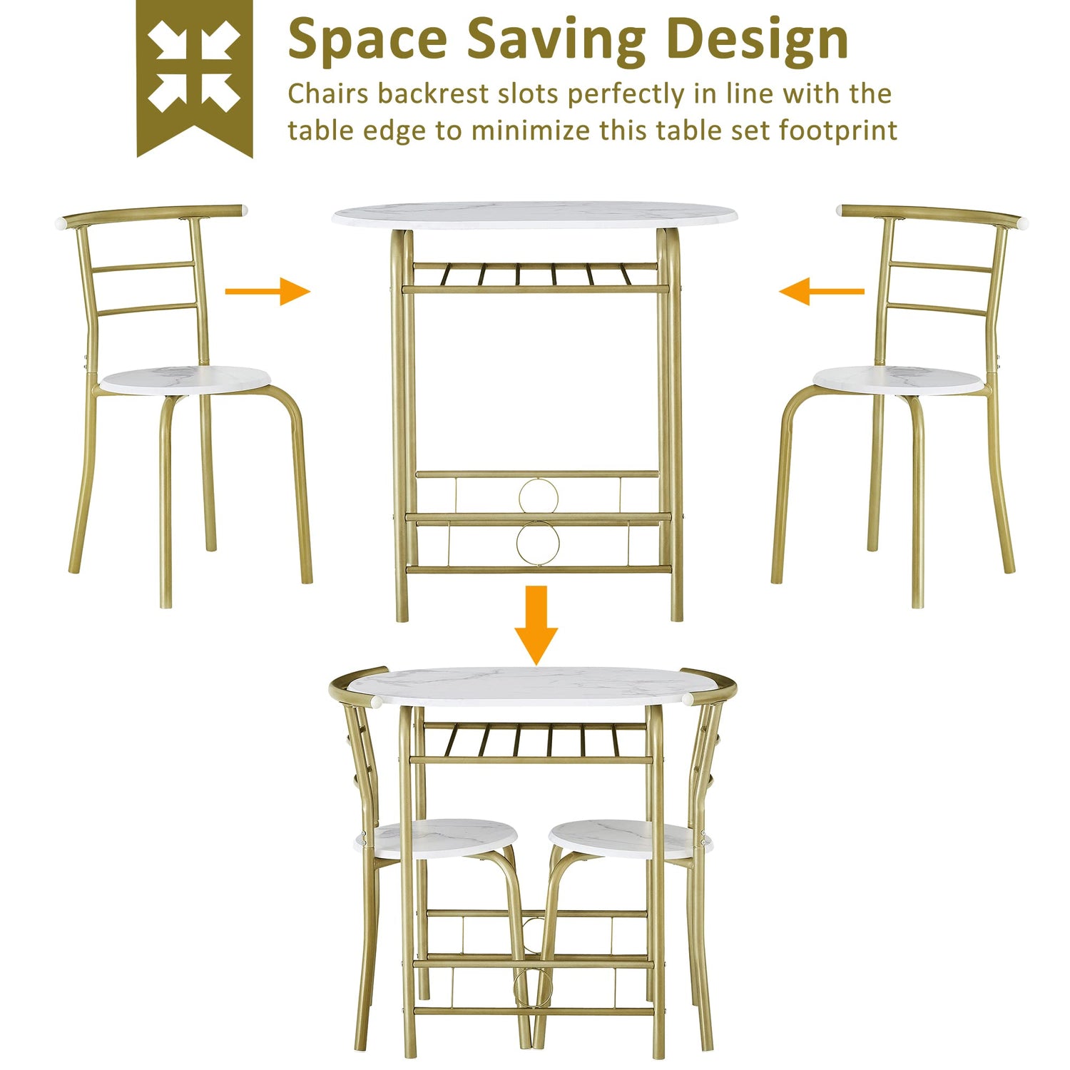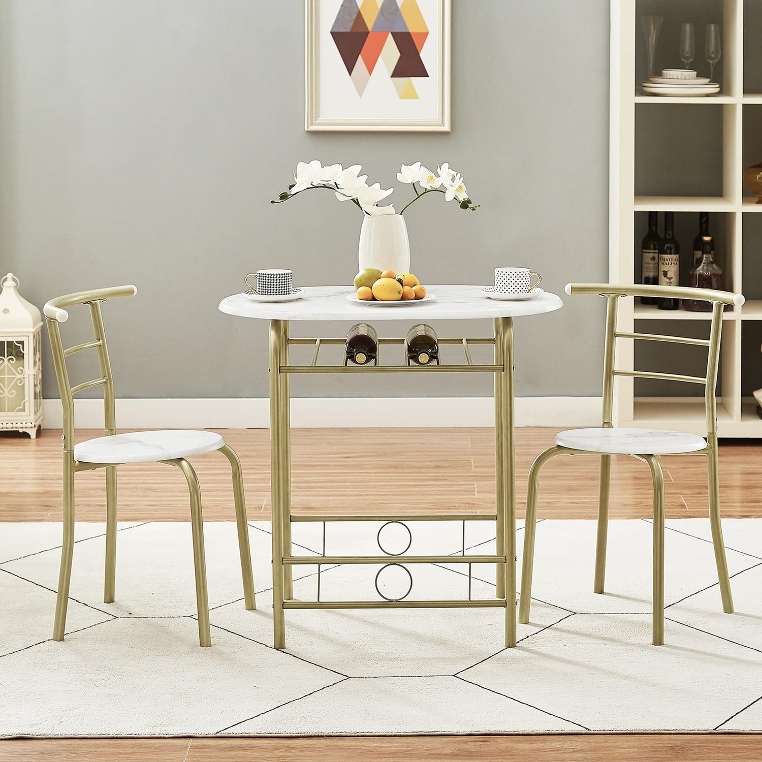 VECELO White & Gold 3-Piece Dining Table Set with Wine Rack for Small Spaces