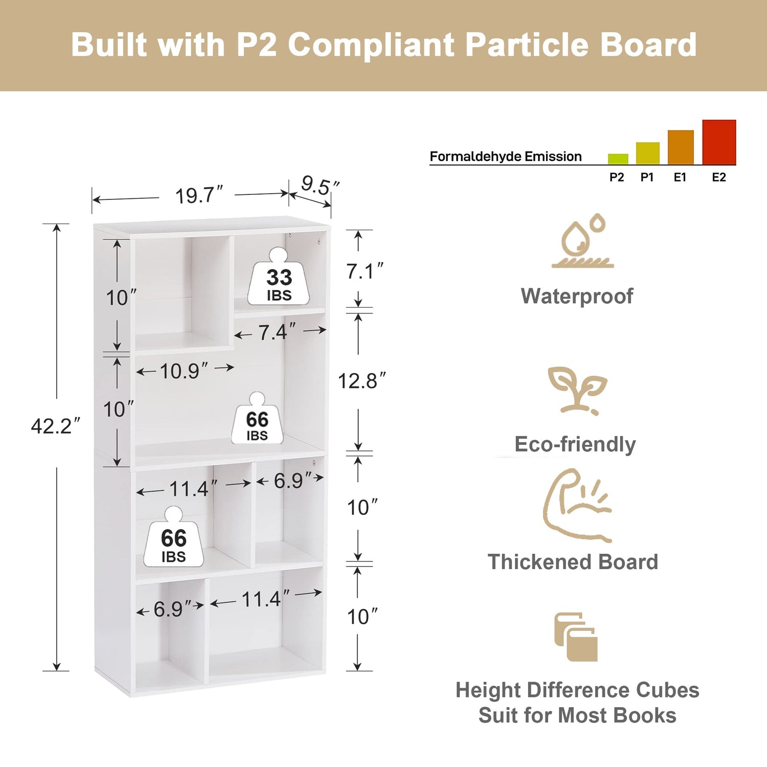 VECELO 42" Modern White Bookshelf, 7 Cube Organizer Bookcase,Fits Tallest Hardcovers, Horizontal Available,Floor Standing Display,Easy Assembly, Pearl White