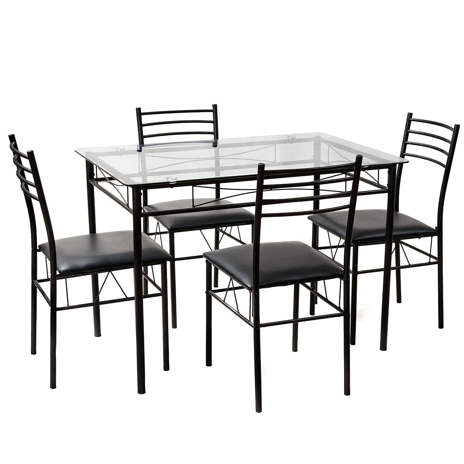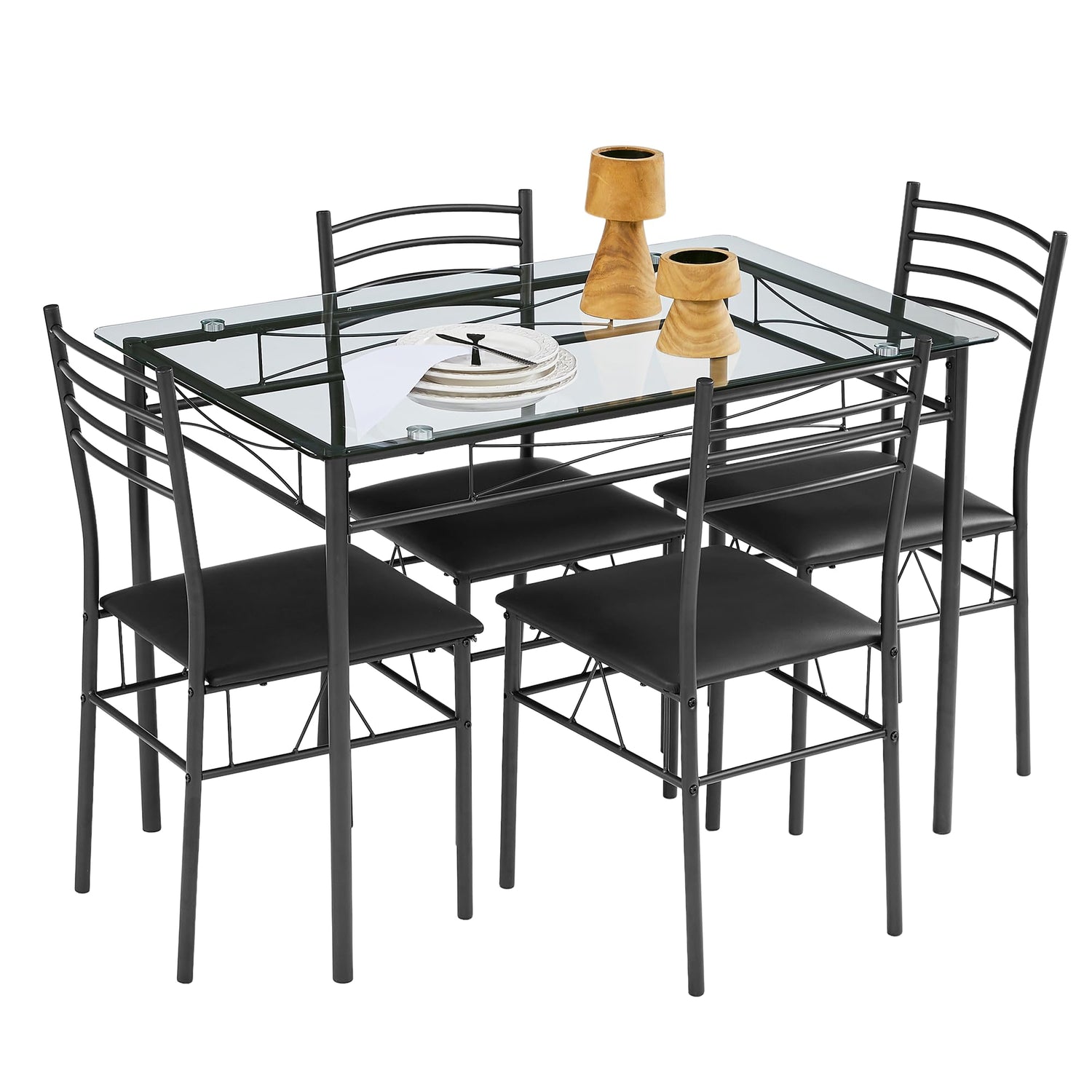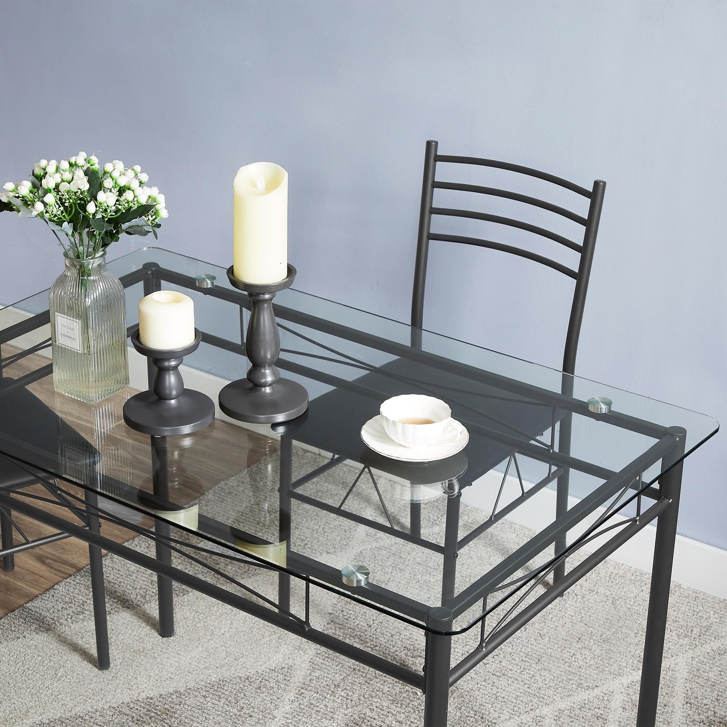 VECELO 5-Piece Kitchen Dining Table Set, Glasses Tabletop & Heavy-Duty Metel Frame, Rectangle Dinette with 4 Chairs for Small Space, Breakfast Nook, Glasses & Black