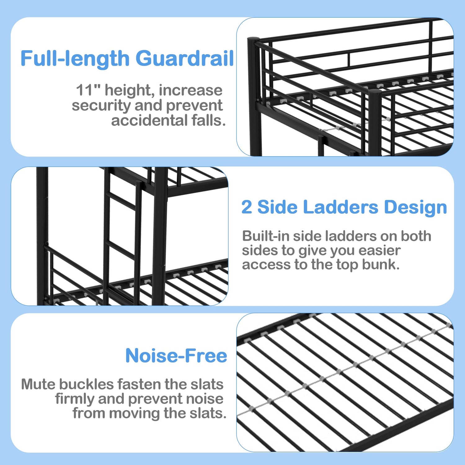 - [Safety Bunk Beds] - The upper bed is surrounded by 11" height full-length guardrails, ensuring security throughout the night, preventing accidental falls, and providing a safe and cozy environment for you. We've included two side ladders in the design to ensure easy and convenient access to the top bunk.