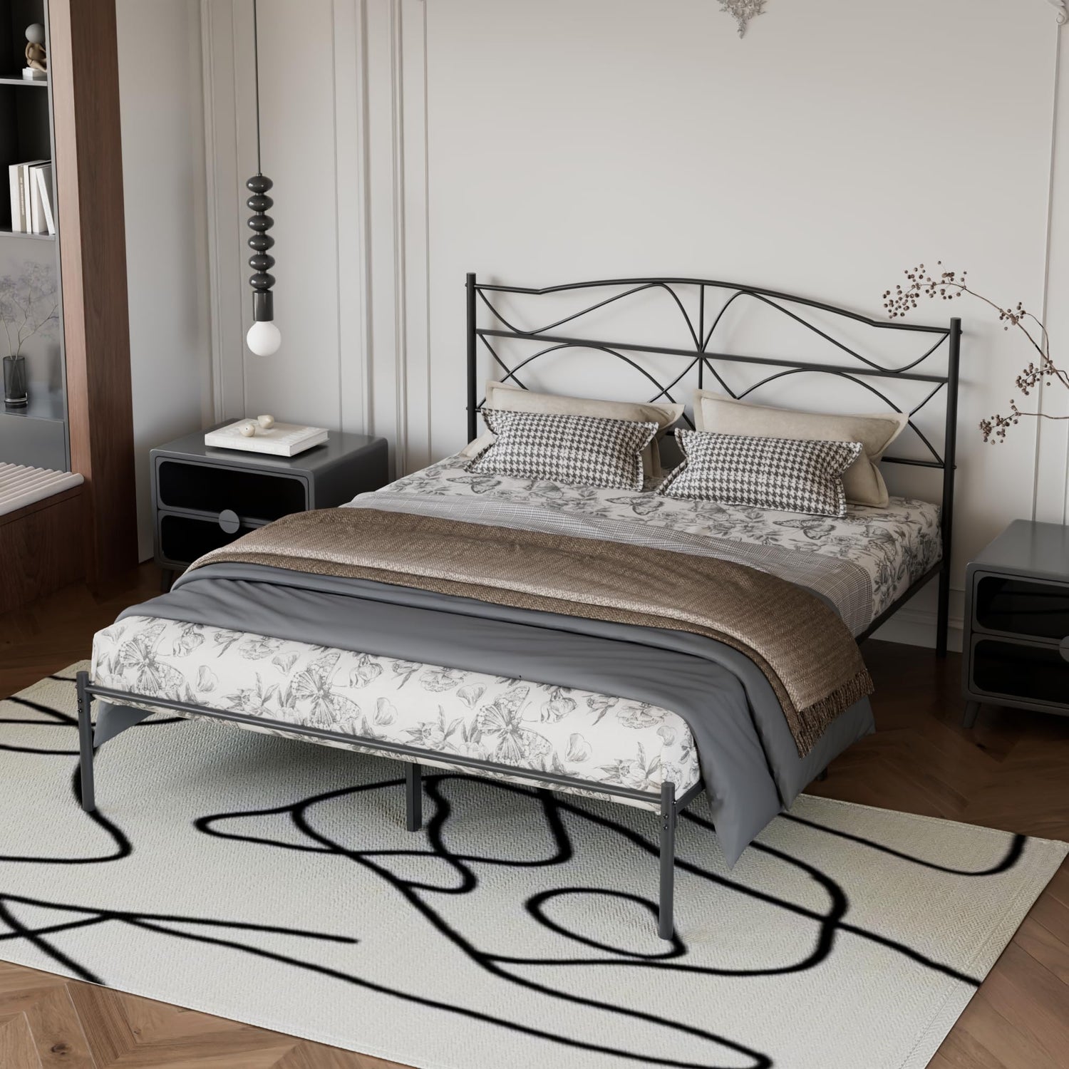 - 【Elegant Wavy Design】- Full size bed frame with french wavy design is powder-coated iron features waterproof and scratch resistance, and the beautiful wavy metal art headboard takes a romantic feeling , with better support brings you tight sleep.