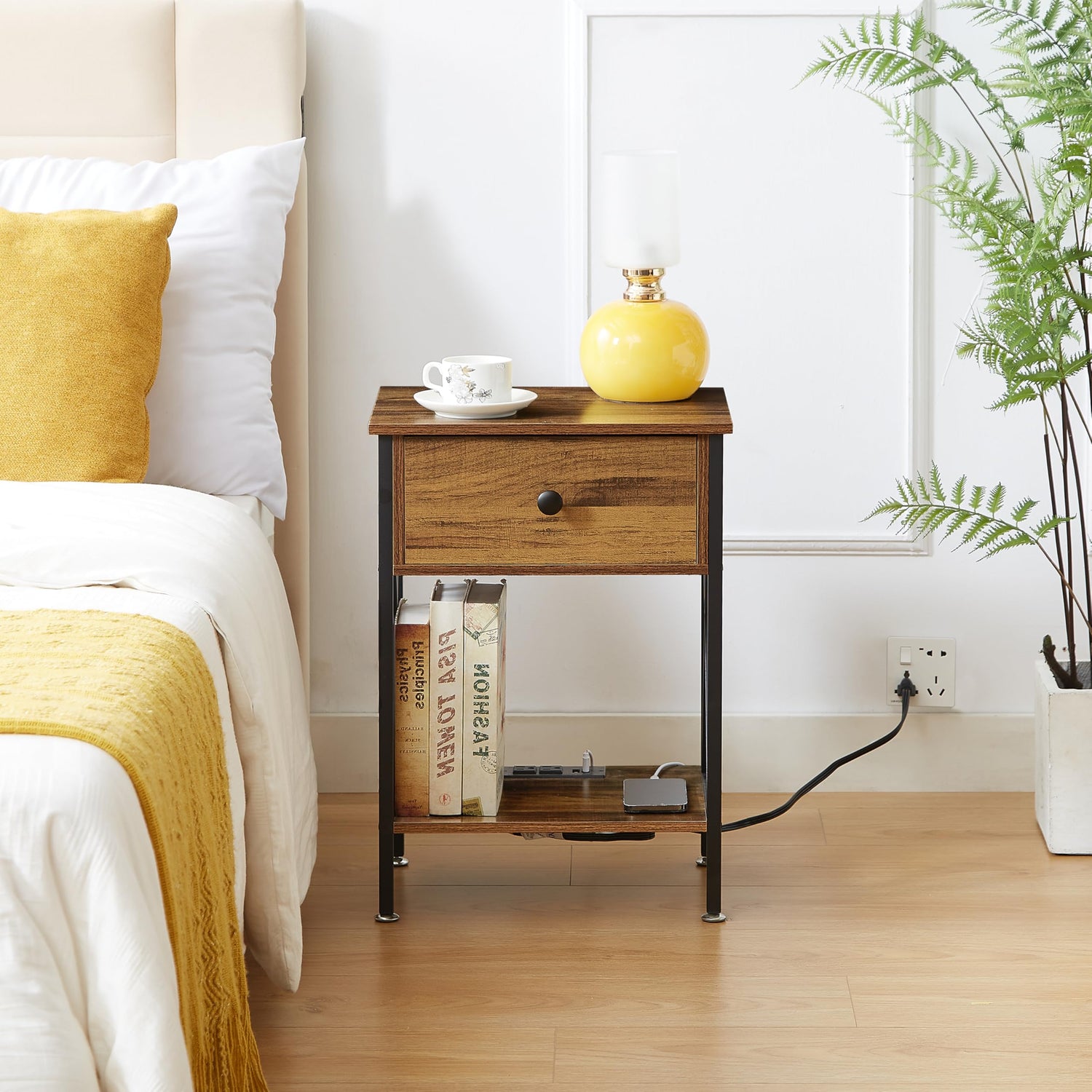 - 【Well-Made & Durable】Looking beautiful while also very durable, this nightstand is made of premium wooden board in classic color, together with the quality metal frame, and easy to integrate with your furniture.