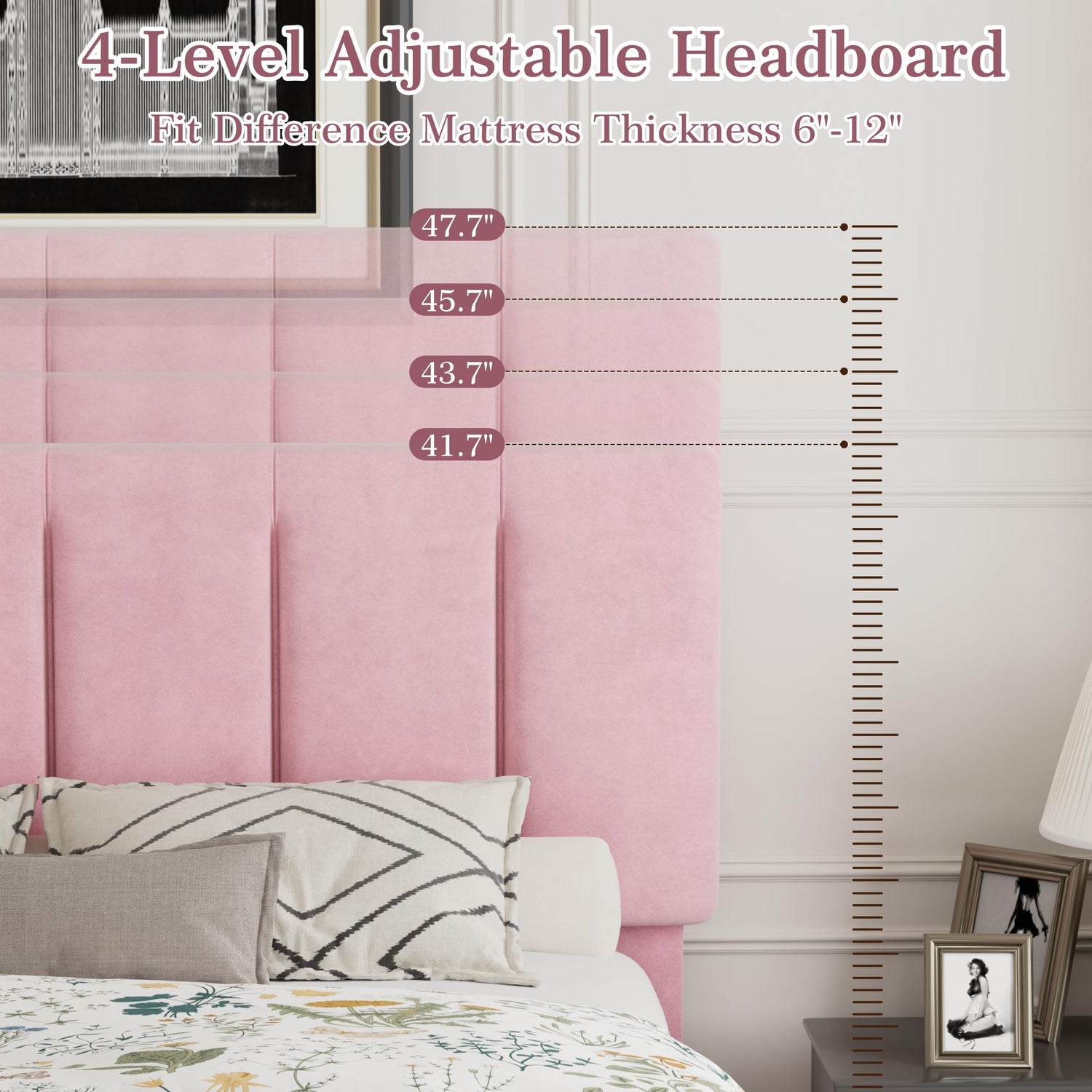- [Versatile Headboard Design] - This queen bed frame offers 4-position height adjustment ranging from 41" to 47", accommodating a wide variety of mattress thicknesses and personal preferences.