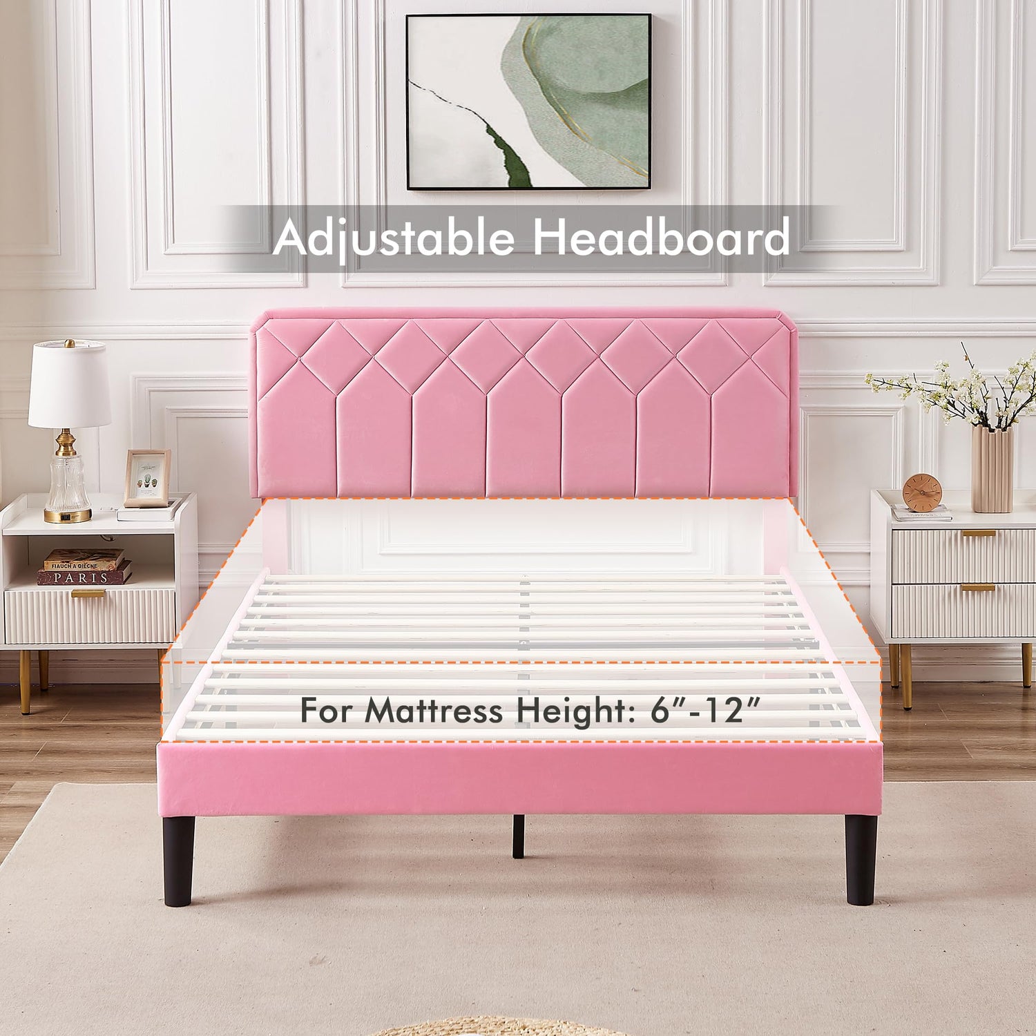VECELO Queen Size Bed Frame Premium Velvet Upholstered Platform with Height Adjustable Headboard/Mattress Foundation, Solid Wooden Slat Support, No Box Spring Needed/Easy Assembly