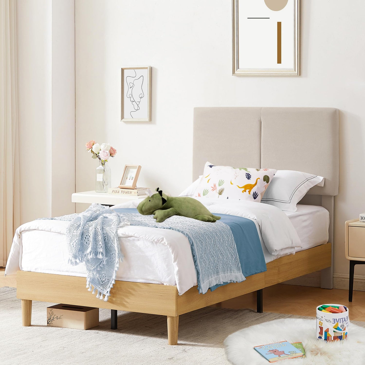 VECELO Twin Frame Upholstered Platform Height-Adjustable Cotton and Linen Headboard, Heavy Duty Wood Slats, 6" Under-Bed Space Noise-Free, No Box Spring Needed,Easy Assembly, Beige