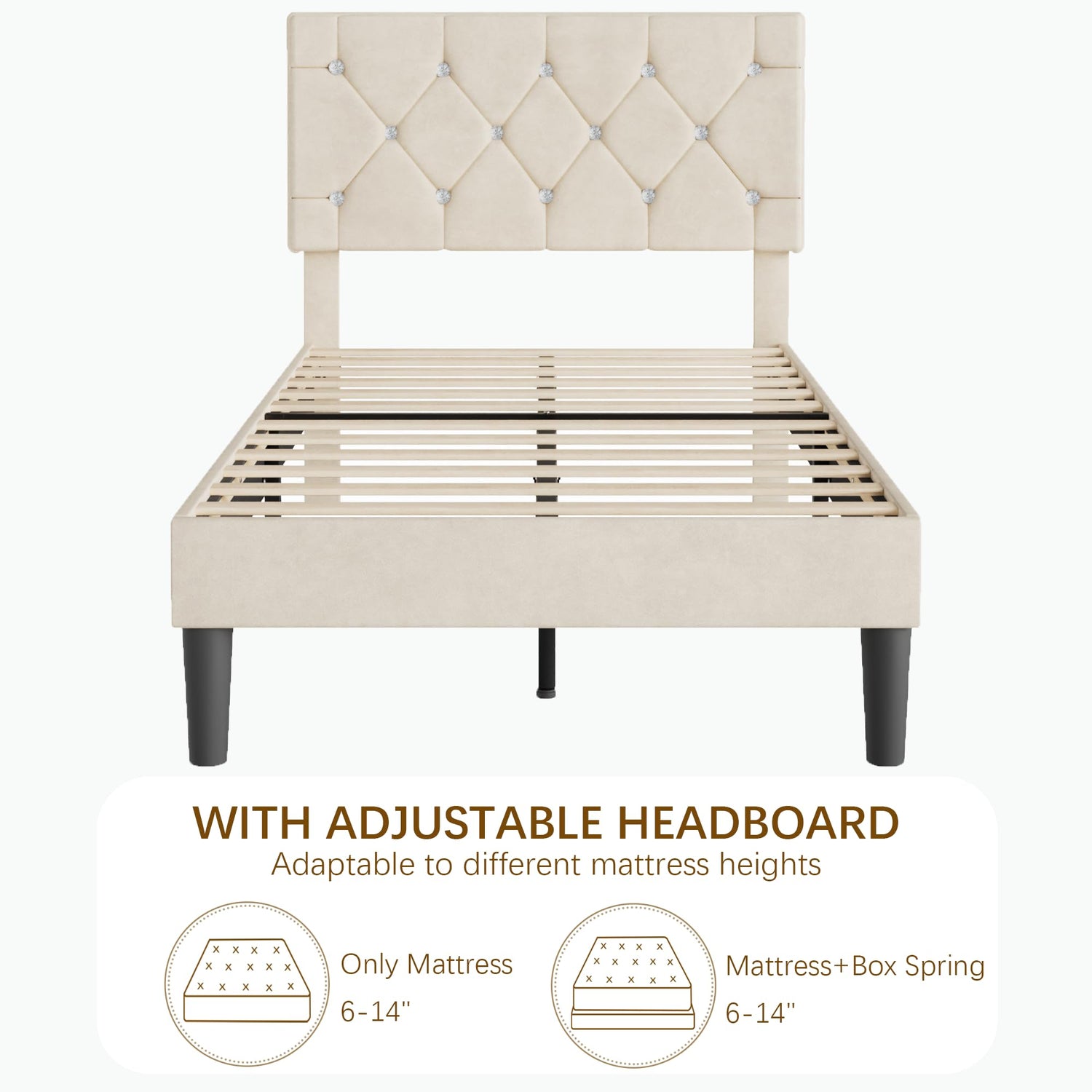 - [Aesthetic and Elegant Design] - This twin bed frame features a beige velvet headboard adorned with diamond and tufted details, creating a visually appealing and elegant atmosphere. Its low-key yet exquisite style fits well with various bedroom decors.