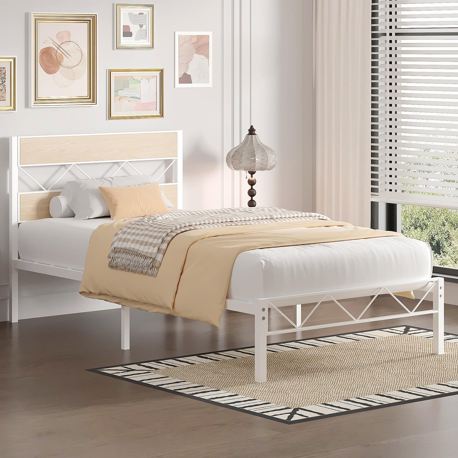 VECELO Twin Size Bed Frame with Headboard, Heavy-Duty Platform Bedframe with Metal Slats Support, No Box Spring Needed, Easy Assembly, White & Natural