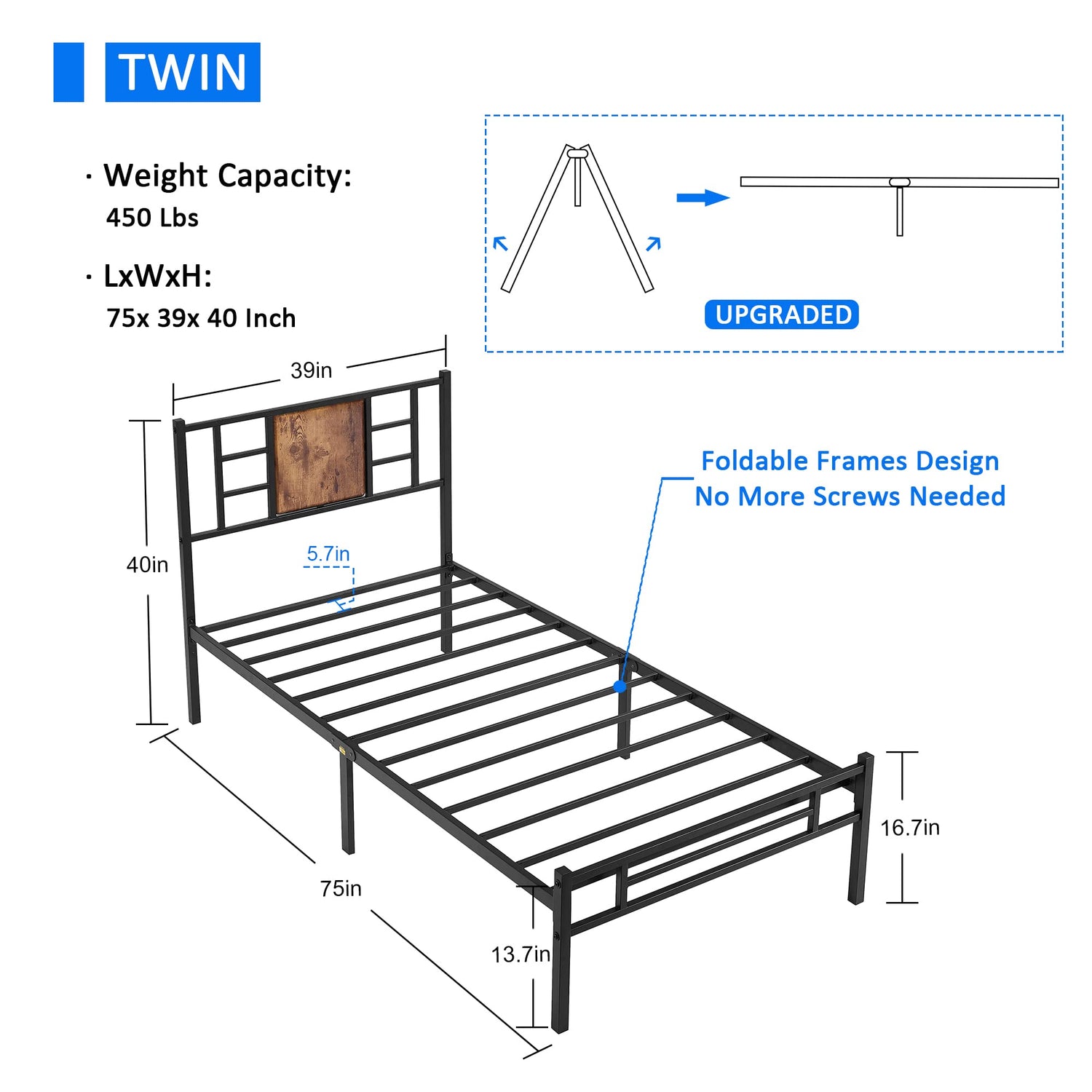 - [Sturdy Structure] - This twin bed frame combines high-quality metal and wood, with a strong metal frame and warm, aesthetically-pleasing brown wooden headboard. The combination creates a sturdy, supportive structure.