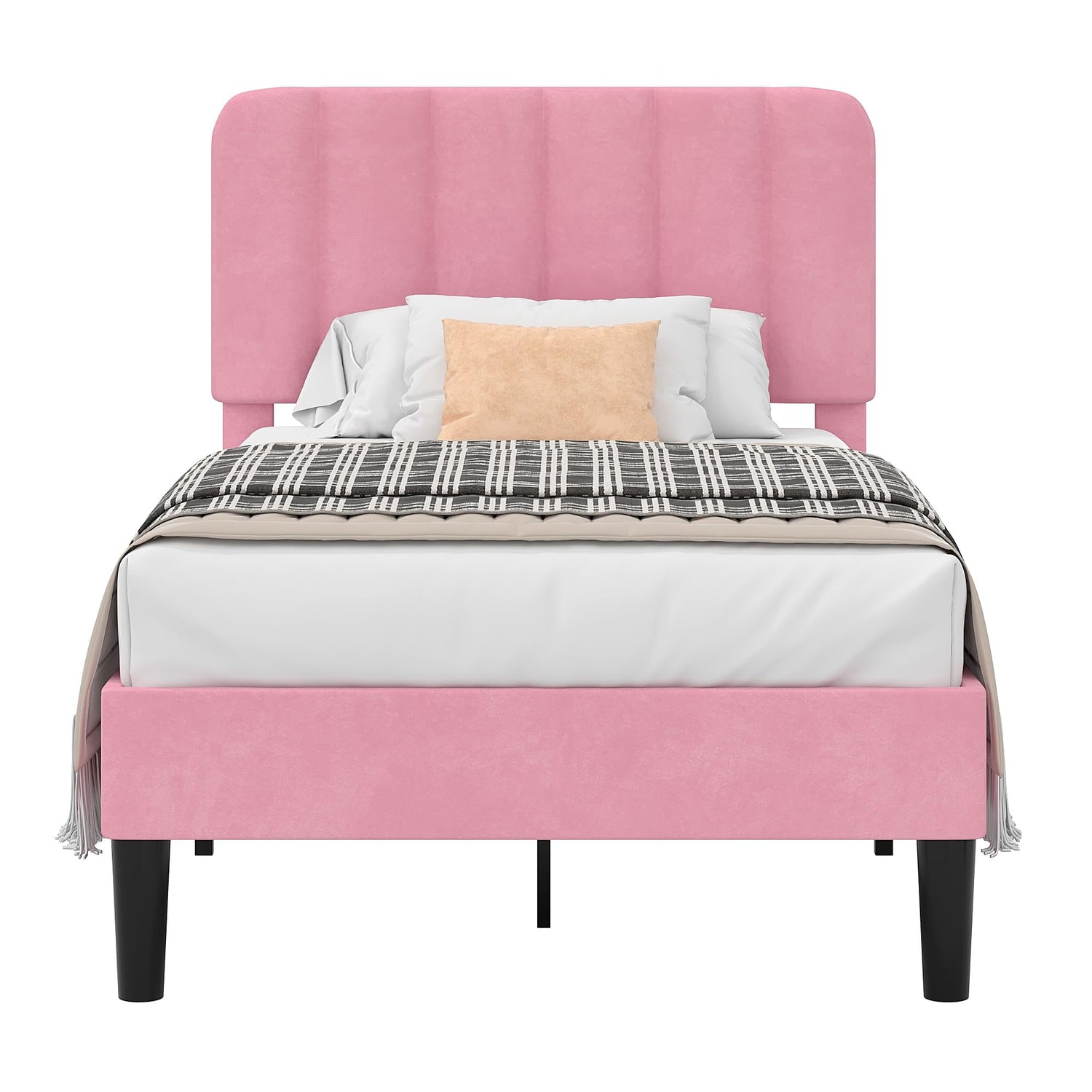 VECELO Twin Size Bed Frame with Upholstered Headboard, Velvet Platform Bedframe Mattress Foundation, Strong Wood Slat Support, No Box Spring Needed,Pink