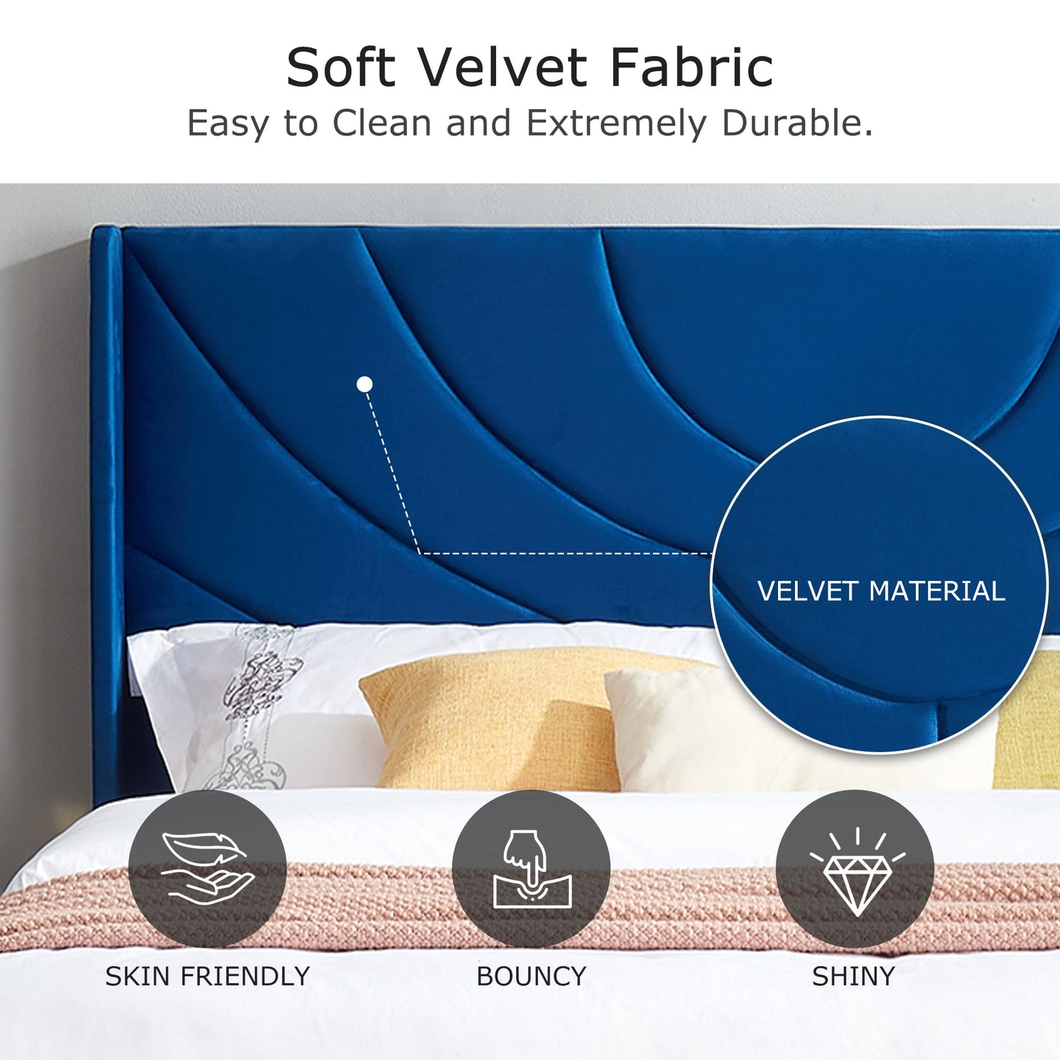 - 【Velvet-Upholstered Fabric】The surface is upholstered in velvet fabric, offer a luxuriously soft and smooth touch. The fabric’s rich sheen adds a touch of elegance and warmth to the bedroom, creating a cozy and sophisticated atmosphere.