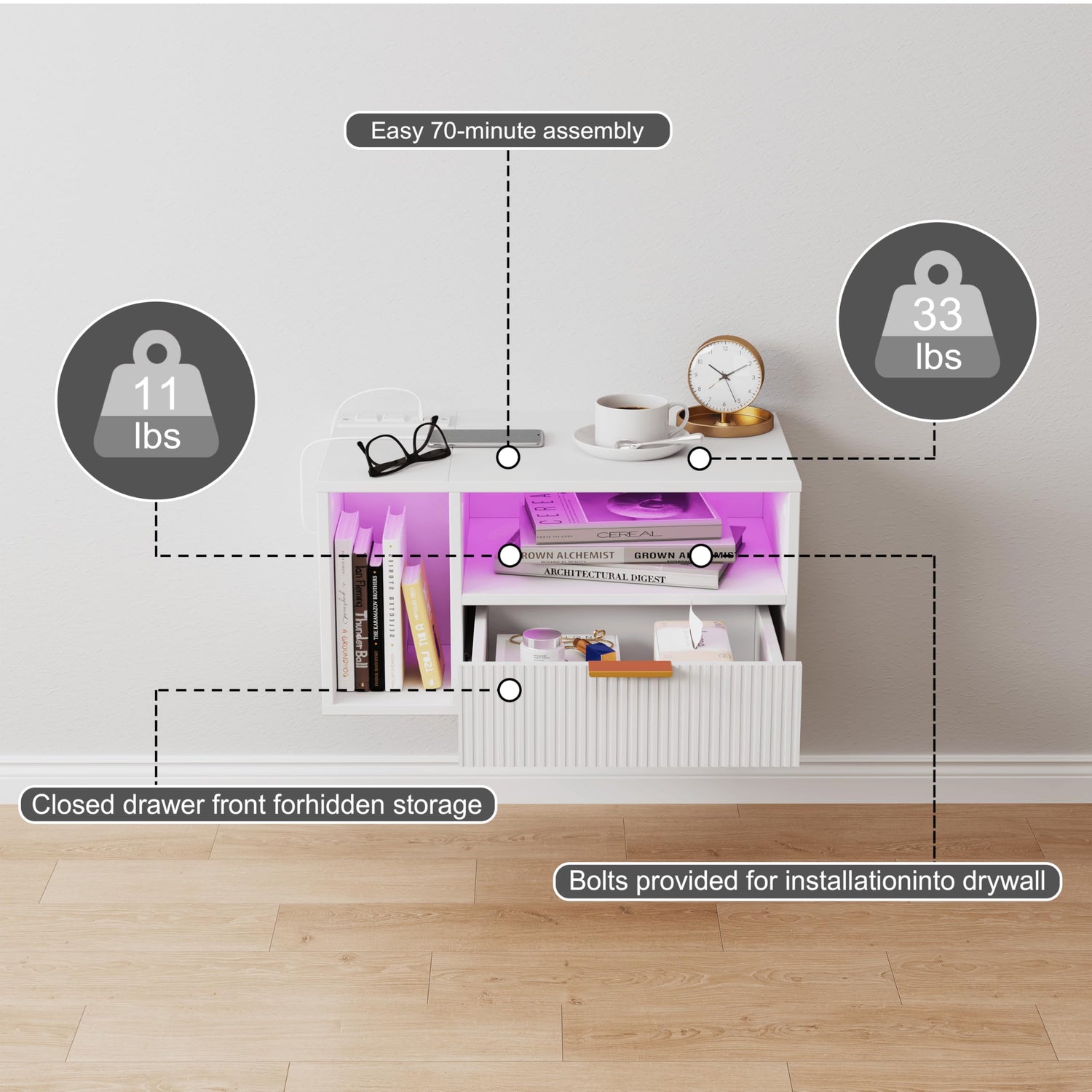 - Embrace the modern touch: A classic white vertically textured faucet, this floating nightstand gives off a modern touch in your bedroom. With a row insert makes it more practical, the atmosphere lamp is a good addition to the fun of life, it can also be used as a bedside table or vanity shelf for the whole family to attract attention, adding elegance to family life.
