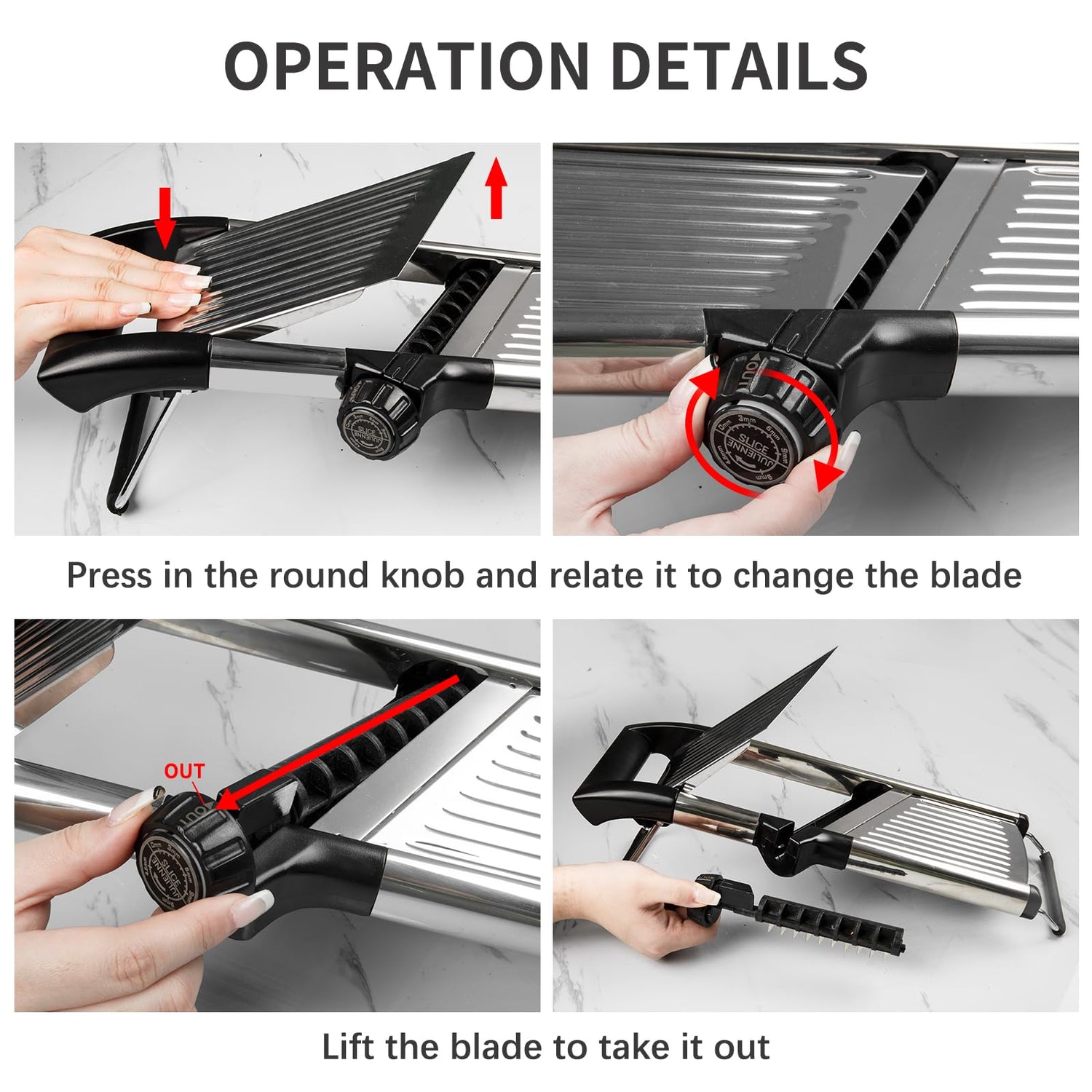 - 🔥[Professional Mandoline Slicer for Kitchen]:Our vegetable slicer is made with top-quality stainless steel, with sharp food-grade blades,unlikely to chip, dull or bend.Rotating the switch to change the cutting options,you don't need to touch the blade,the blade is equipped with a protective cover to prevent cuts when not in use.