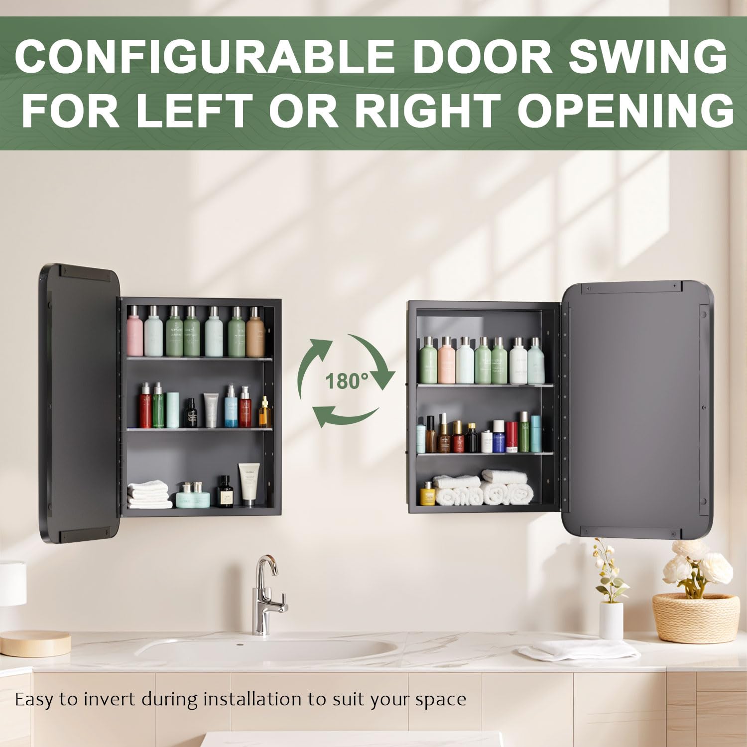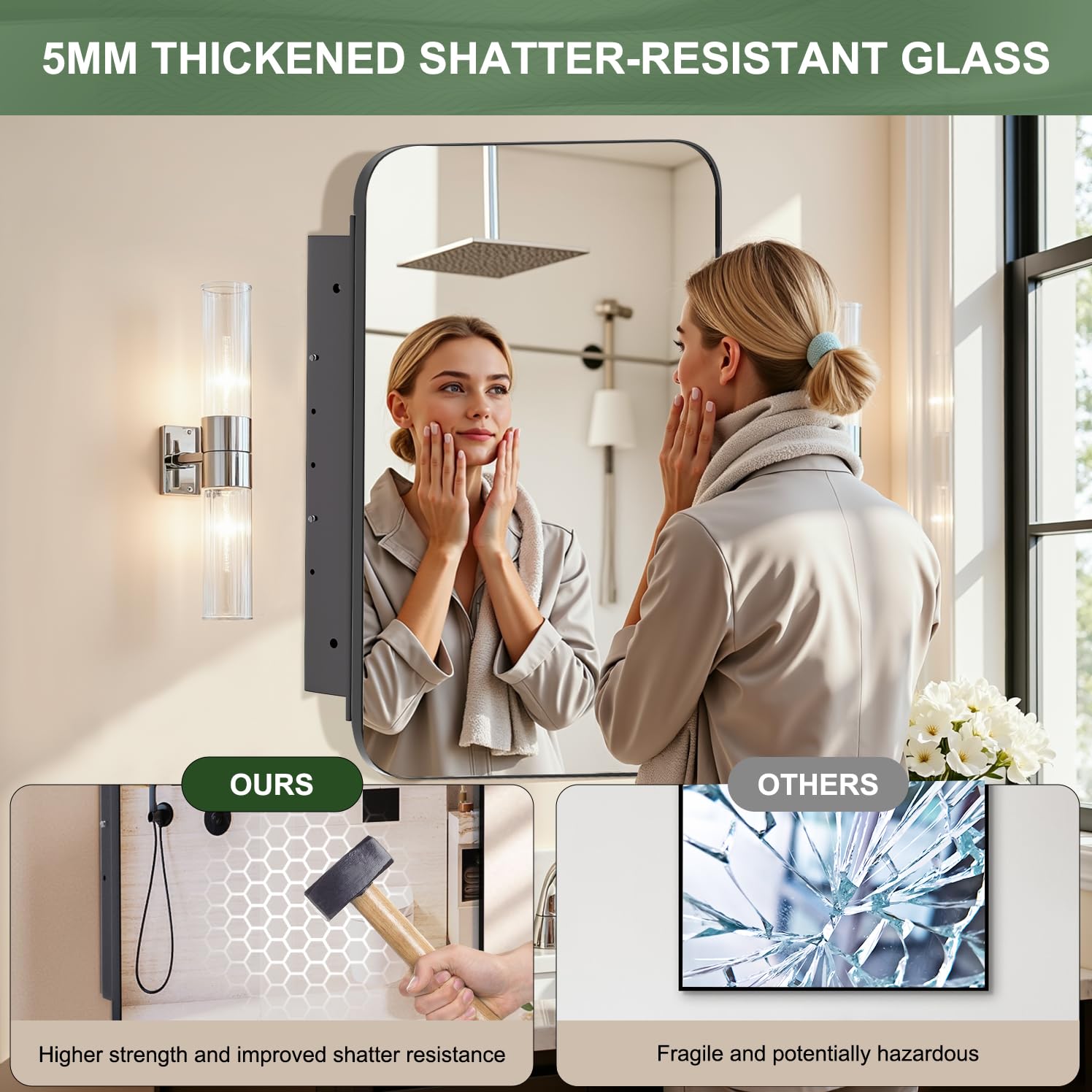 - HEAVY DUTY METAL MEDICINE CABINET: This bathroom cabinet is made of heavy-duty metal, ensuring moisture and rust resistance, and providing exceptional durability. The medicine cabinet mirror features a classic rounded rectangular design, perfectly complementing various bathroom decor styles-from modern and industrial to farmhouse, minimalist, and luxurious