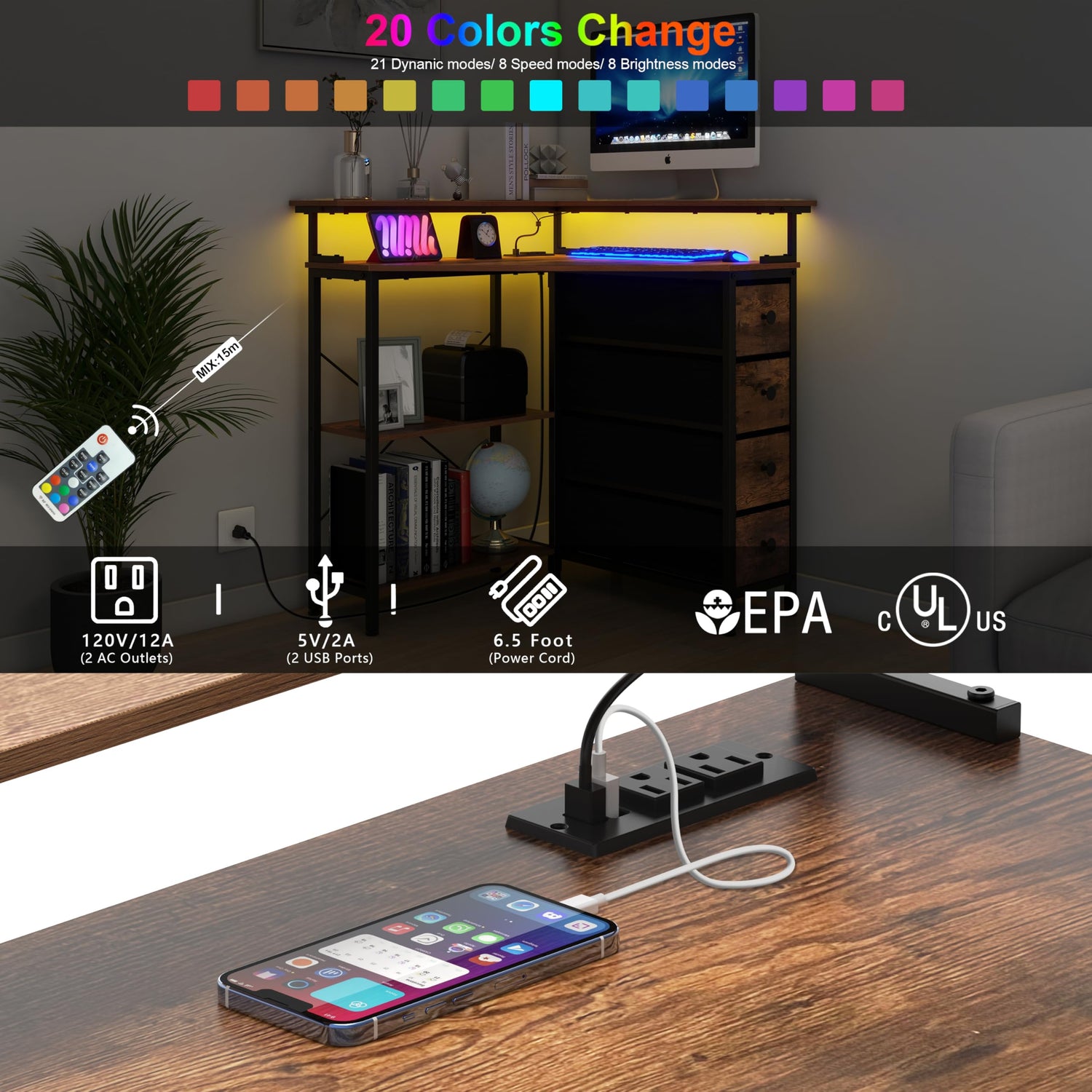- Charging Station and LED Lights Equipped with 2 AC outlets, 2 USB ports, this computer desk with shelves can easily charge your phones, gaming gear,printer and other office devices, avoiding cluttered wires.The desk comes with RGB LED lights, it has 20 colors change, 21 Dynamic modes, 8 Speed modes, 8 Brightness modes. This LED lighting increase more atmosphere while you use it