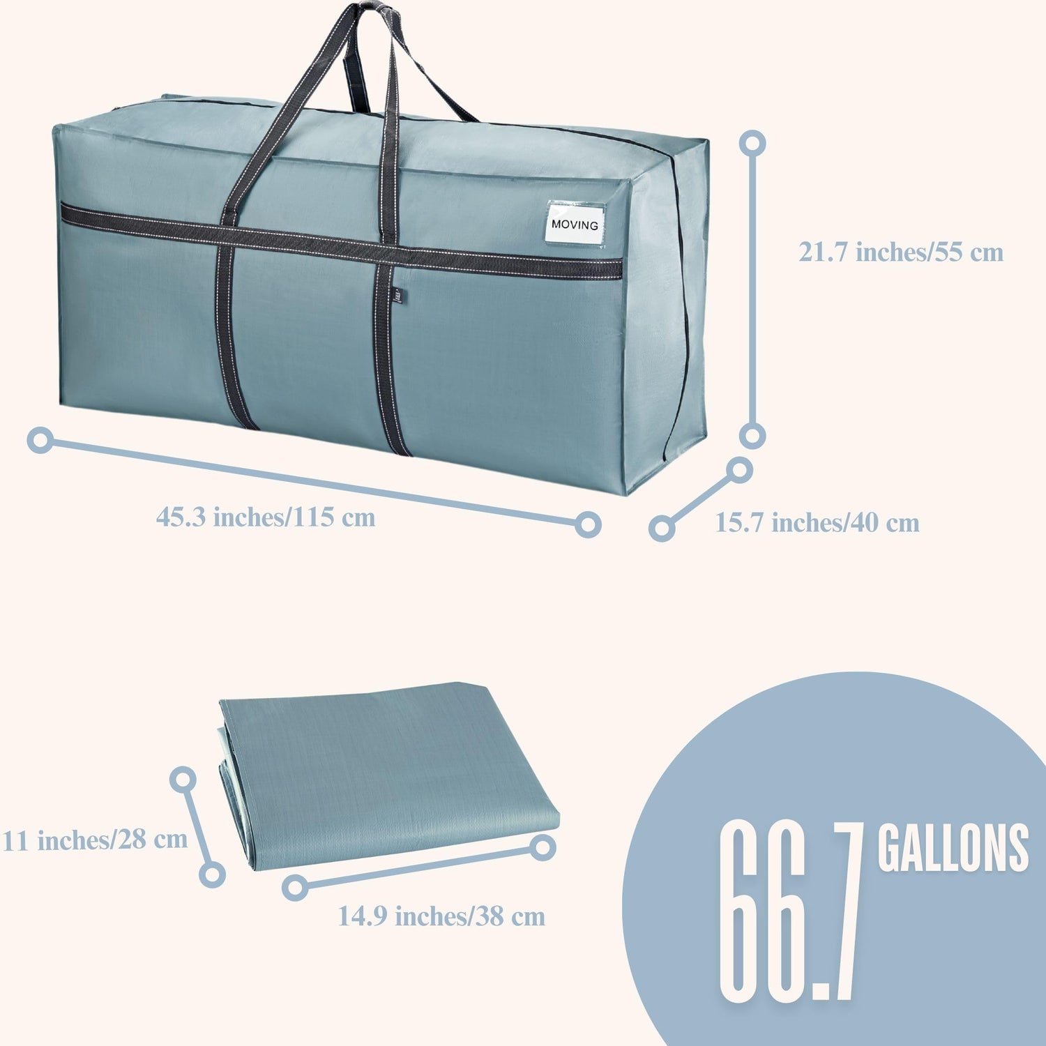 - Extra Large Storage Bag – Measuring 45.3" W X 21.7" H X 15.7" D, this large moving bag is twice the size of general packing bags on the market. It can store a large amount of clothes, blankets, pillows, beddings, and organize other household items all at once, helping you save space in your closet or storage basement. Easily identify your items with the clear tag pocket, perfect for custom labels to distinguish your belongings quickly. This bag can also store a 7.5 ft Christmas tree, making it ideal for Christmas tree storage.
