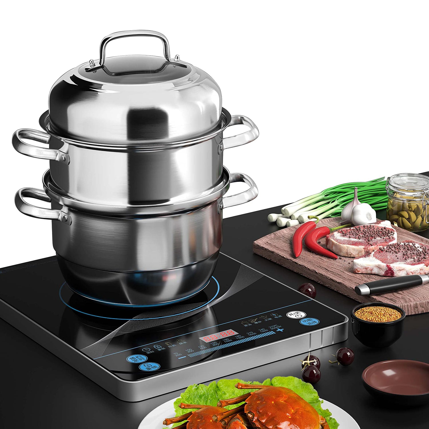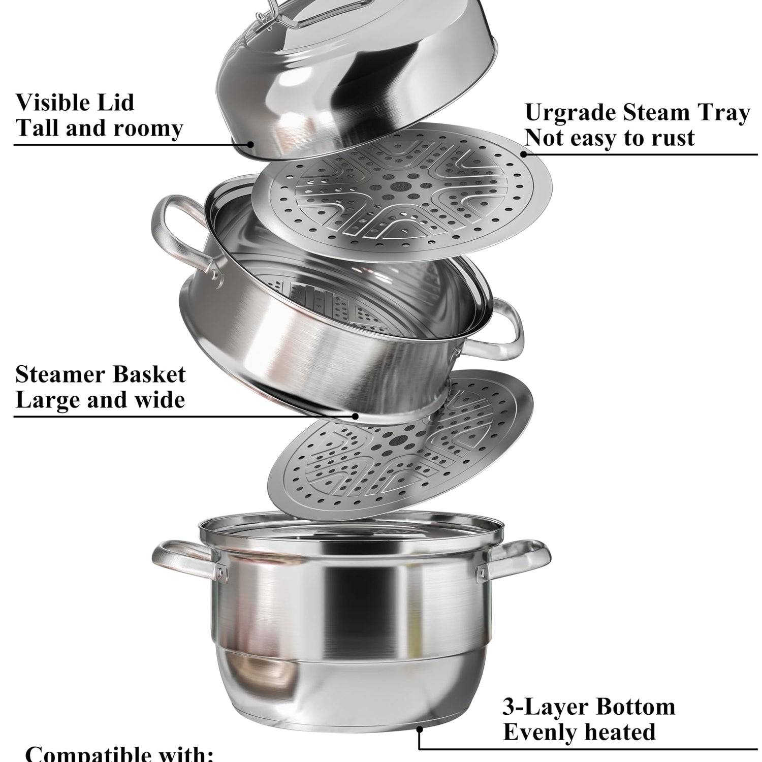 - Steamer Cooking Compatible with: Induction cooktop, electric, gas and stove top