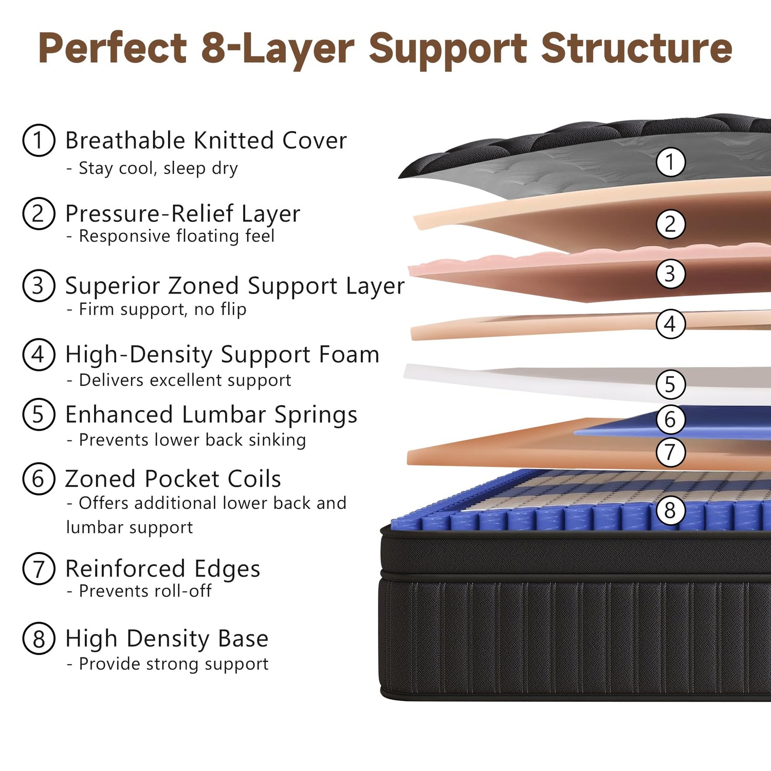 - Ergonomic Design for Healthier Sleep - Our hybrid mattress queen are ergonomically designed, consists of multiple layers of high-quality memory foam and enhanced Independent Pocket Springs, With superior comfort and targeted support, it can fully care for your body curves, relax your muscles in 360°, relieves stress and back pain for truly restful sleep.