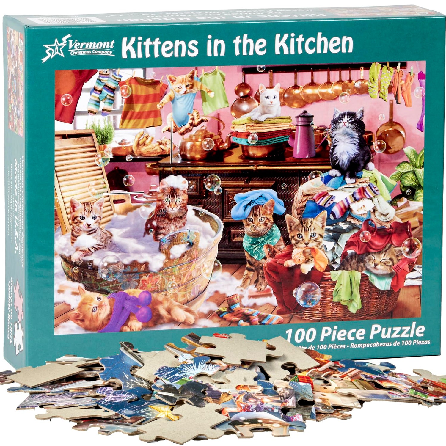 Vermont Christmas Company Kittens in The Kitchen Jigsaw Puzzle 100 Piece, Large Pieces Perfect for Kids and Seniors