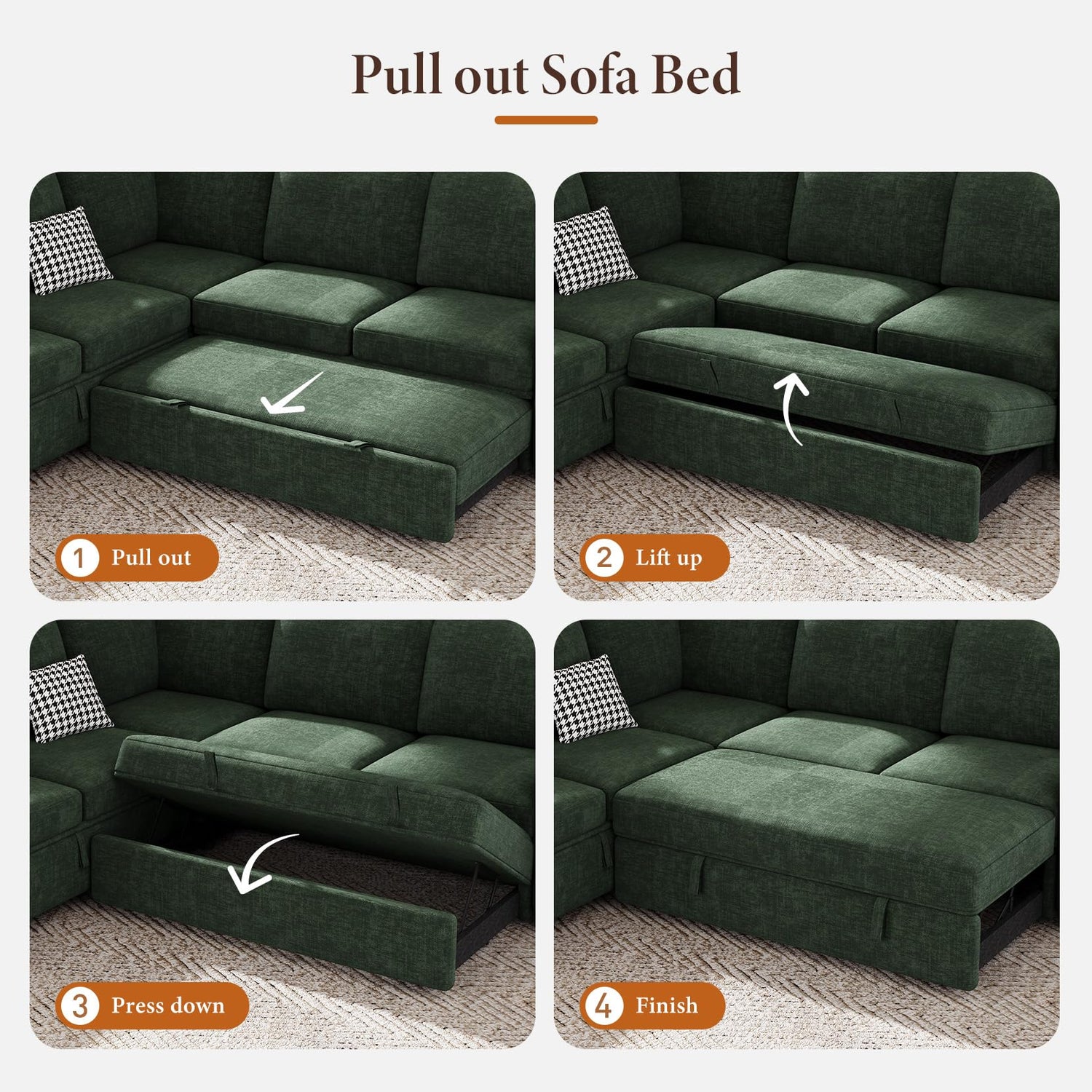 - Easily Assemble: This sleeper couch is easy to be assembled by 2 persons, following the detail instructions step by step. The sectional sofa bed is delivered in 4 boxes, which may arrive on different days. Before assembling, please check all parts. If you have any questions or are dissatisfied with our sleeper sofa, please contact us immediately.