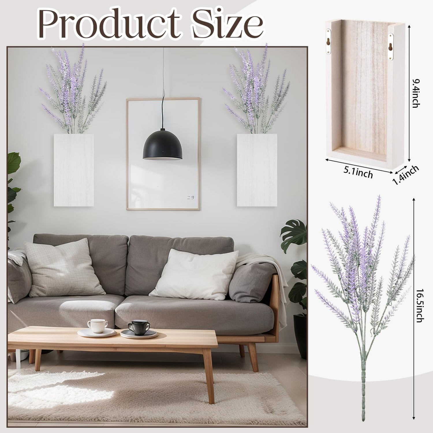 - Wall Planter Set: comes with 2 pieces of wall hanging planters, and 2 bunches of false lavender, each indoor wall planter is about 5.1 x 9.4 x 1.4 inches/ 13 x 24 x 3.5 cm; Tips: lavender may be squeezed and deformed during transportation, please gently straighten it by hand before placing it in the vase