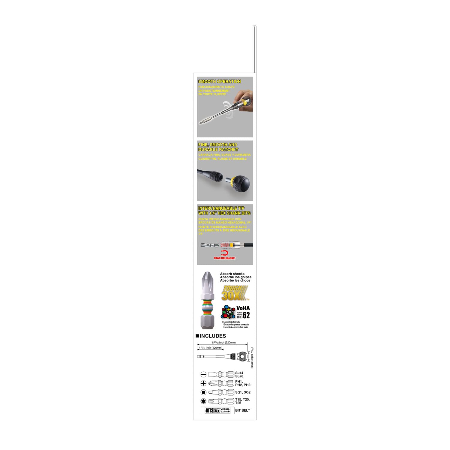 Details: ● Including 10PC. bits; PH1, PH2, PH3, SL6, SQ2, T10, T15, T20, T25, & T30 ● Tip Interchangeable Ratchet Screwdriver ● Interchangeable with 1/4” Hex shank bits ● Powerful Rare-Earth magnet with SUS holder head keeps strong magnet force forward ● Functionally enhanced BALL GRIP with 36-teeth gear ratchet for smooth driving by simple repeated finger or wrist movement ● Using as a stubby ratchet by popping off the blade and inserting 1/4" Hex shank bits ● High wear-resistance and durable fully hardened shank by optimum heat treatment ● Ergonomic BALL GRIP™ for anti-fatigue and various way of driving