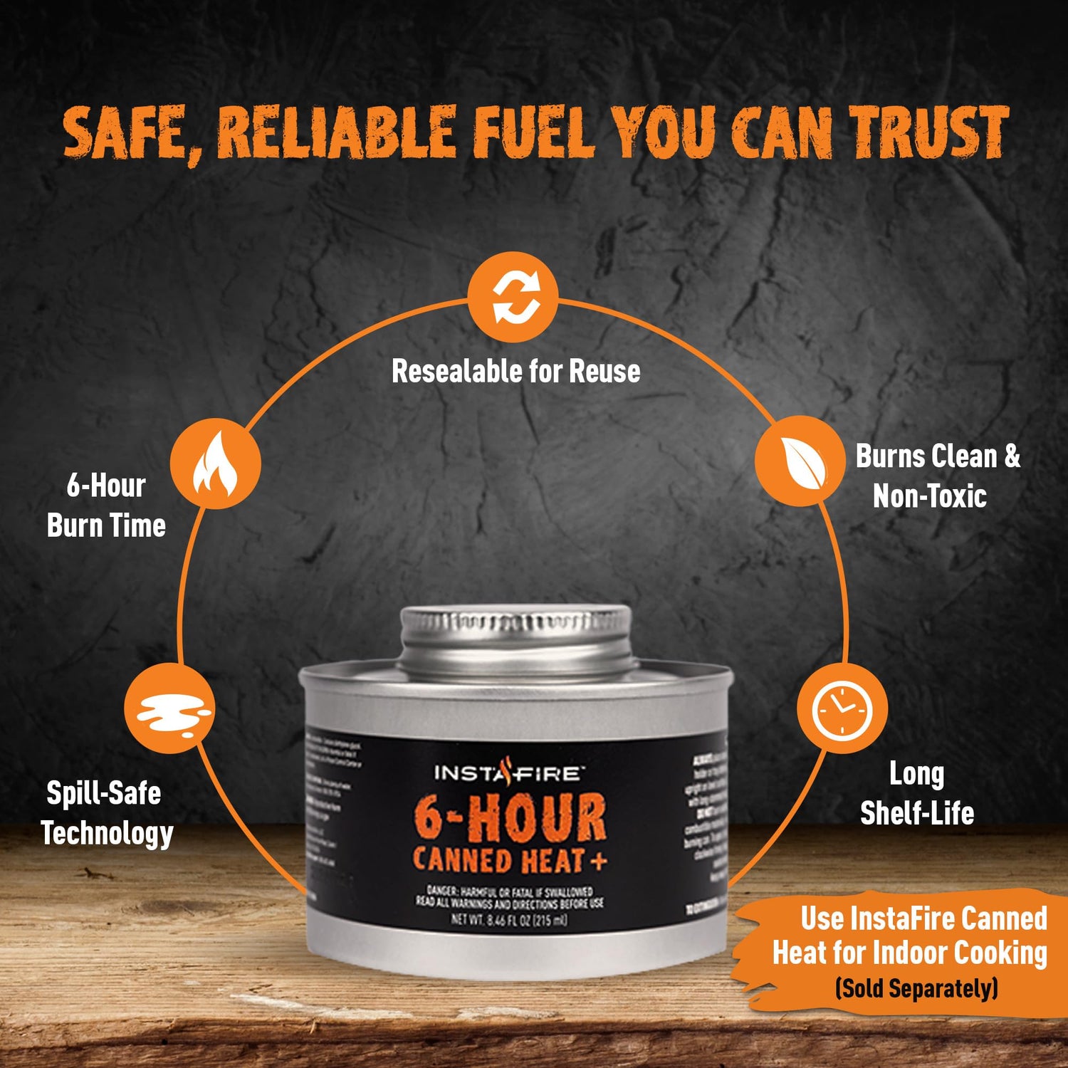 - Fueled by Canned Heat (3 Included): Safe for Indoor Use. *Canned heat is chafing fuel—odorless, smokeless, nontoxic, and generally safe for indoor use. It is still HIGHLY recommended to provide adequate ventilation in any room where it is in use.