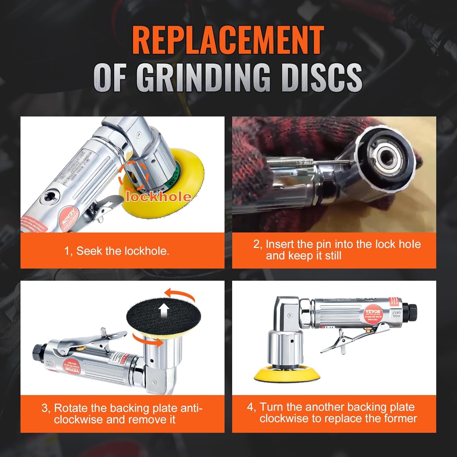 - Easy Replacement of Grinding Disc: 1. Seek the lockhole. 2. lnsert the pin into the lock hoIe and keep it still. 3. Rotate the backing plate anti- clockwise and remove it. 4. Turn the another backing plate clockwise to replace the former.