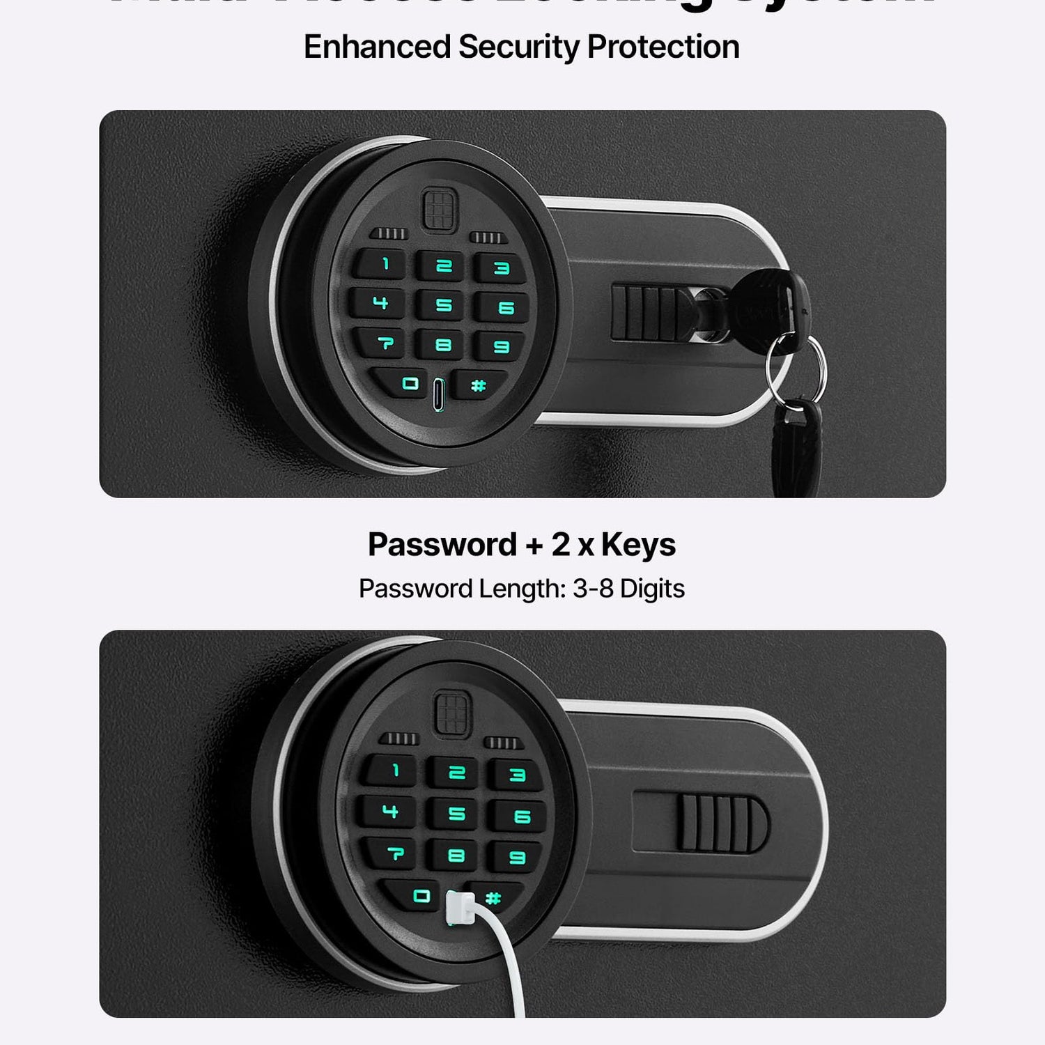 - Smart Lock: The 9-digit touchscreen password lock provides quick access. The password can be set between 3-8 digits, with an auto-lock function for added security. It also includes an emergency key and spare charging box for easy unlocking during battery depletion. (Note: There is no battery inside, you need to buy 4 AA batteries separately.)