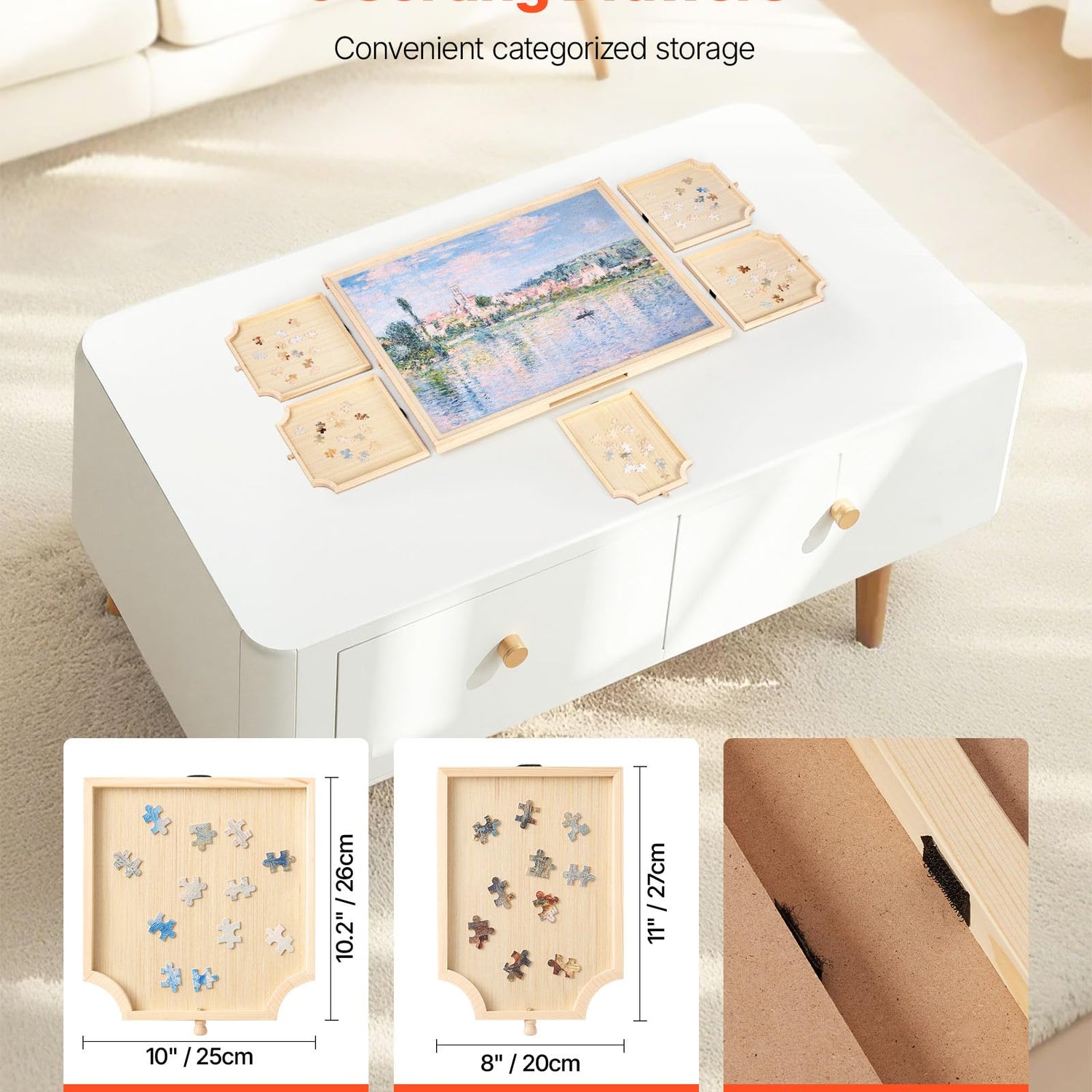 - 5 Storage Drawers: Made from natural pine wood, the wooden jigsaw puzzle board is sturdy, and the smooth surface makes it easy to move the puzzle pieces. It comes with 4 large sliding drawers and 1 small drawer for convenient storage