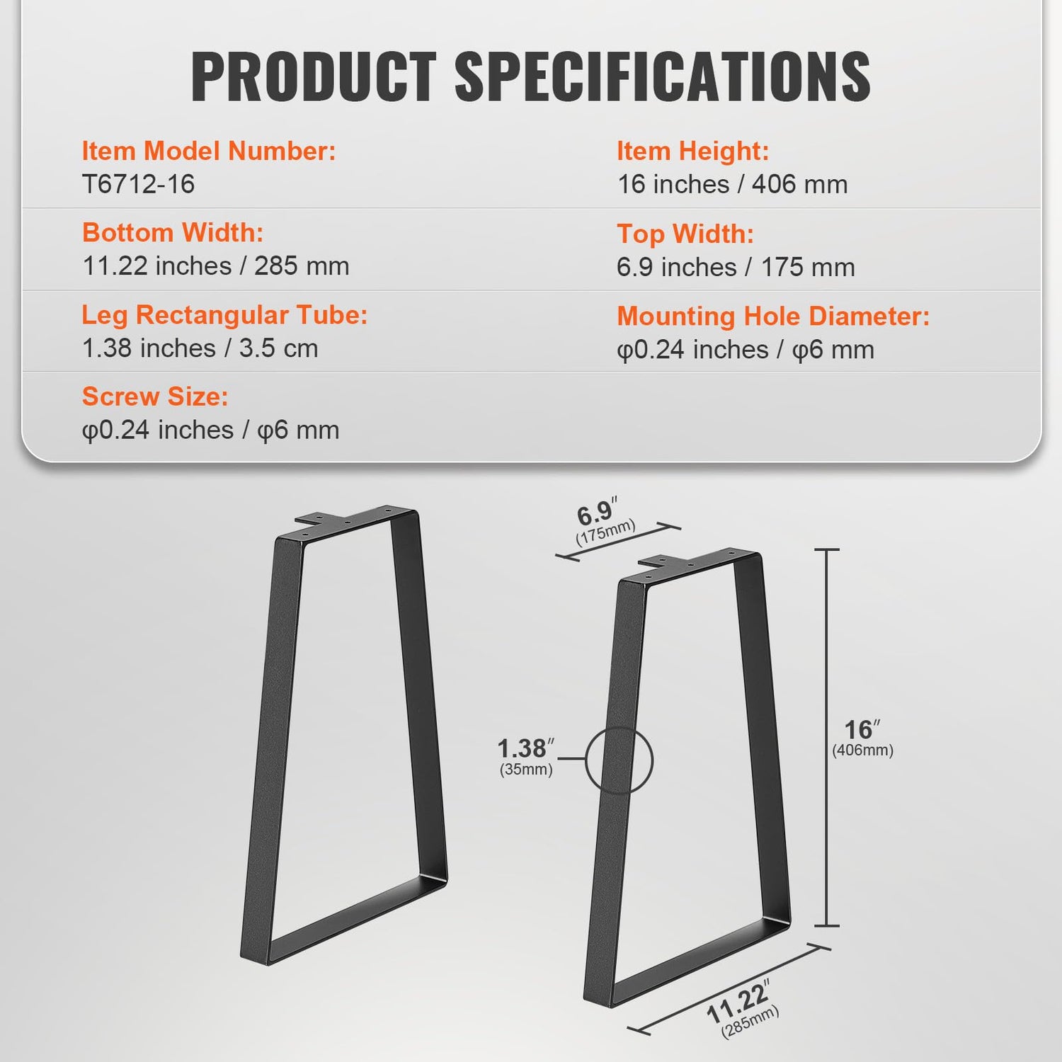 VEVOR 16 inch Trapezoid Steel Table Legs, Replacement Furniture Legs Set of 2 for DIY Coffee Tables, Modern Desks, Bench, Night Stands, Sofa, Max Load 400 lbs Heavy Duty, Quick Instalation Legs Black