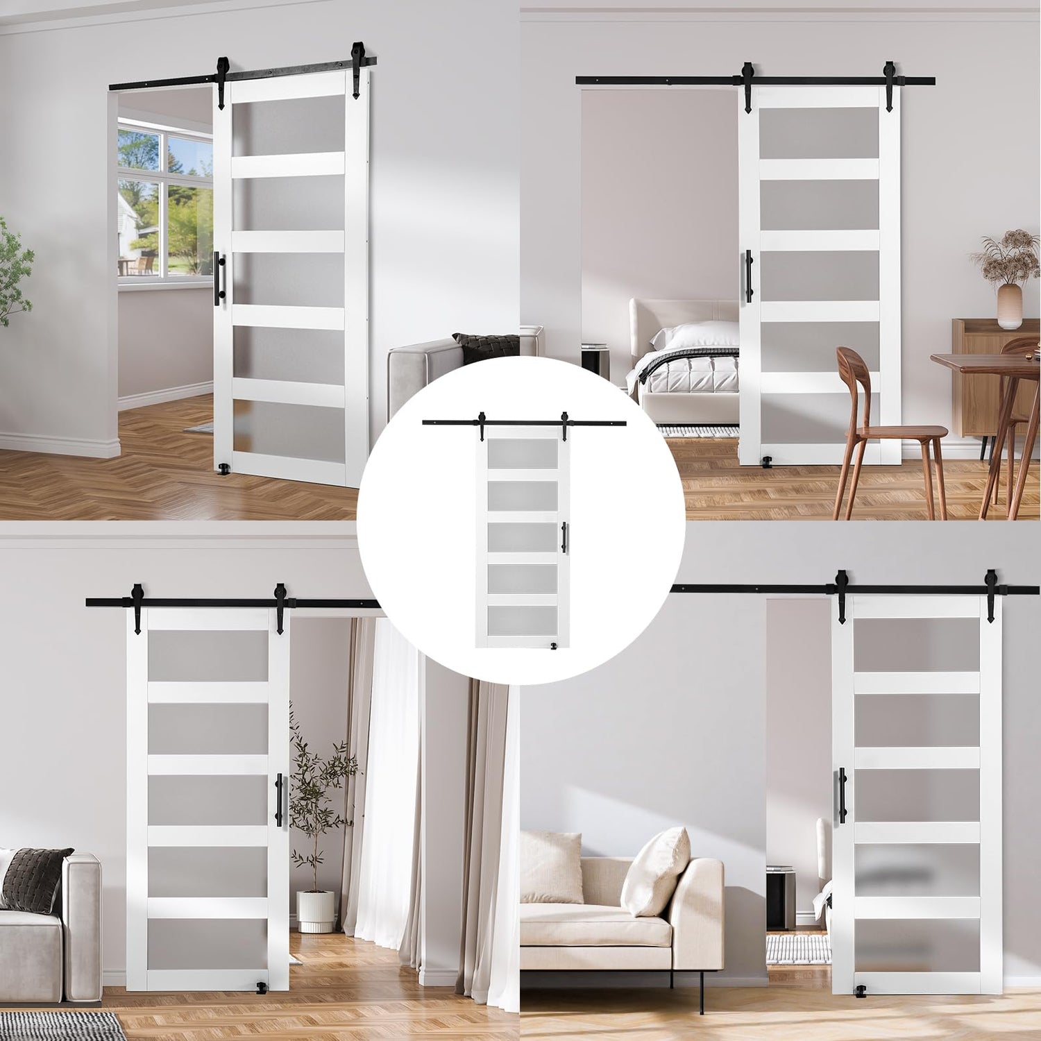 VEVOR 36x84 Inch Glass Barn Door with 6.6ft Sliding Door Hardware Kit Included, 5 Frosted Glass, Water-Proof & Scratch-Resistant Solid Wood, Pre Drilled Easy Assembly with Handle & Floor Guide, White