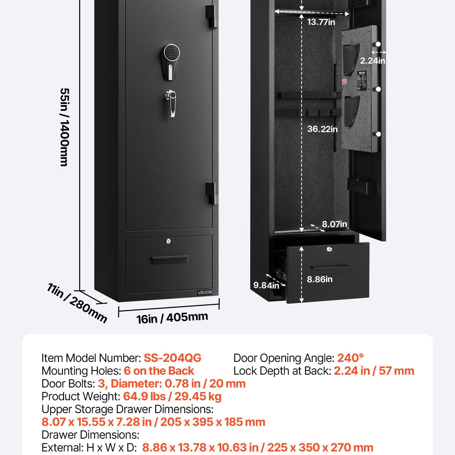 - Large Capacity Safe: This gun safe can hold up to 4 rifles/shotguns (scopes not included), with 2 ammo slots and adjustable gun racks. It also features a bottom drawer for storing firearm accessories, ammunition, or other valuable items