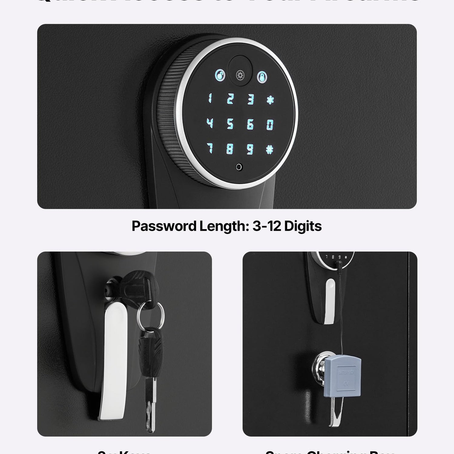 - Smart Lock: The 9-digit touchscreen password lock provides quick access. The password can be set between 3-12 digits, with an auto-lock function for added security. It also includes an emergency key and spare charging box for easy unlocking during battery depletion. (Note: There is no battery inside, you need to buy 4 AA batteries separately.)