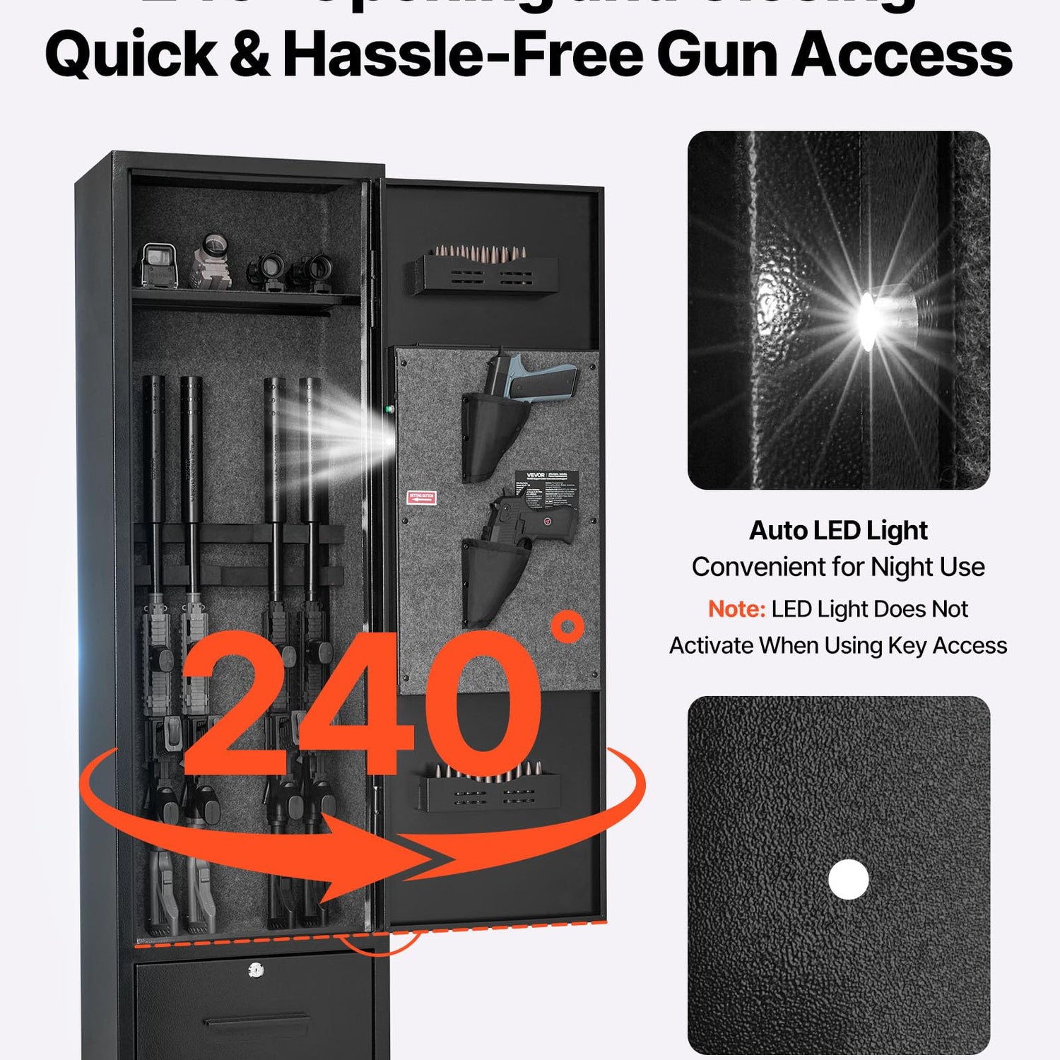 - Quick Access: The 240° wide-angle door opens fully for a clear view of all firearms, making it easy to quickly retrieve your weapons. Inside, it is equipped with auto LED lights, ensuring visibility even in low-light conditions