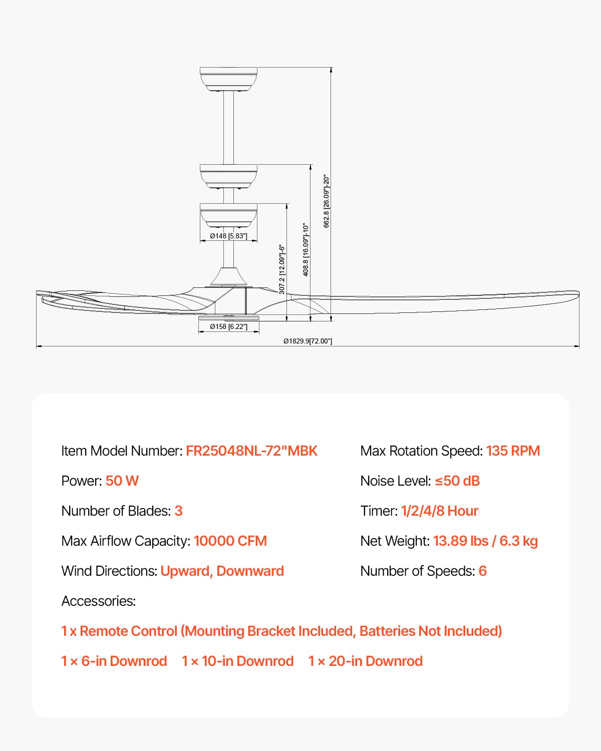 VEVOR 72 Inch Ceiling Fan without Light, 6-Speed Remote Control, 3-Wood-Blade, Reversible DC Motor, Modern Low Profile Flush Mount Exterior Fan for Bedroom, Living Room, Patio, Indoor/Outdoor, Black