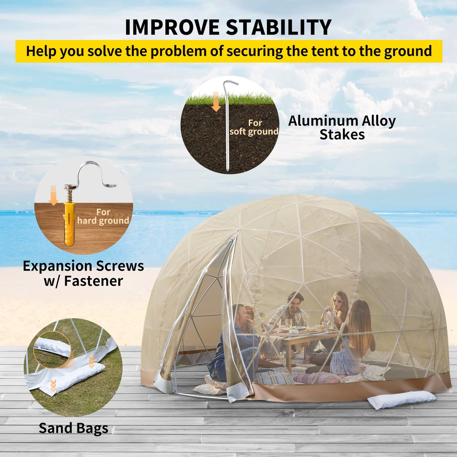 - 🌻🌻【WIND & SNOW RESISTANCE】--The geodesic dome kit adopts a φ 0.63”/16 mm nylon frame, providing extra stability with the help of 10 sandbags,32 expansion screws w/ fastener, and 15 aluminum alloy stakes. It can withstand up to 31 mi/h speed wind and bear max. 90 lbs snow. Feel at ease when you start your next big camping adventure, even on windy days.