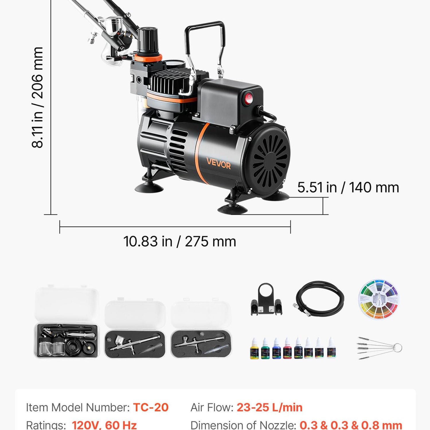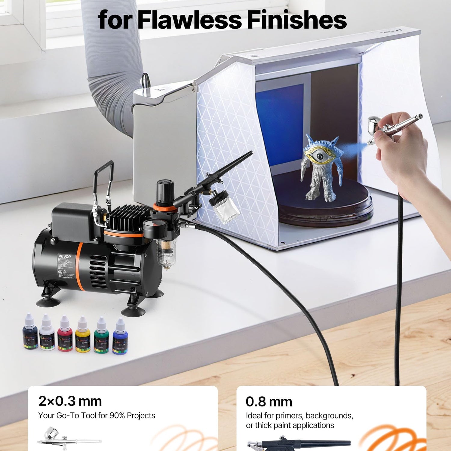 - Precision Atomization for Flawless Finishes: Equipped with 0.3 mm, 0.3 mm, and 0.8 mm nozzles, this airbrush kit lets you create ultra-fine lines, paint large areas faster, and achieve smooth, professional results without blotches or clogs