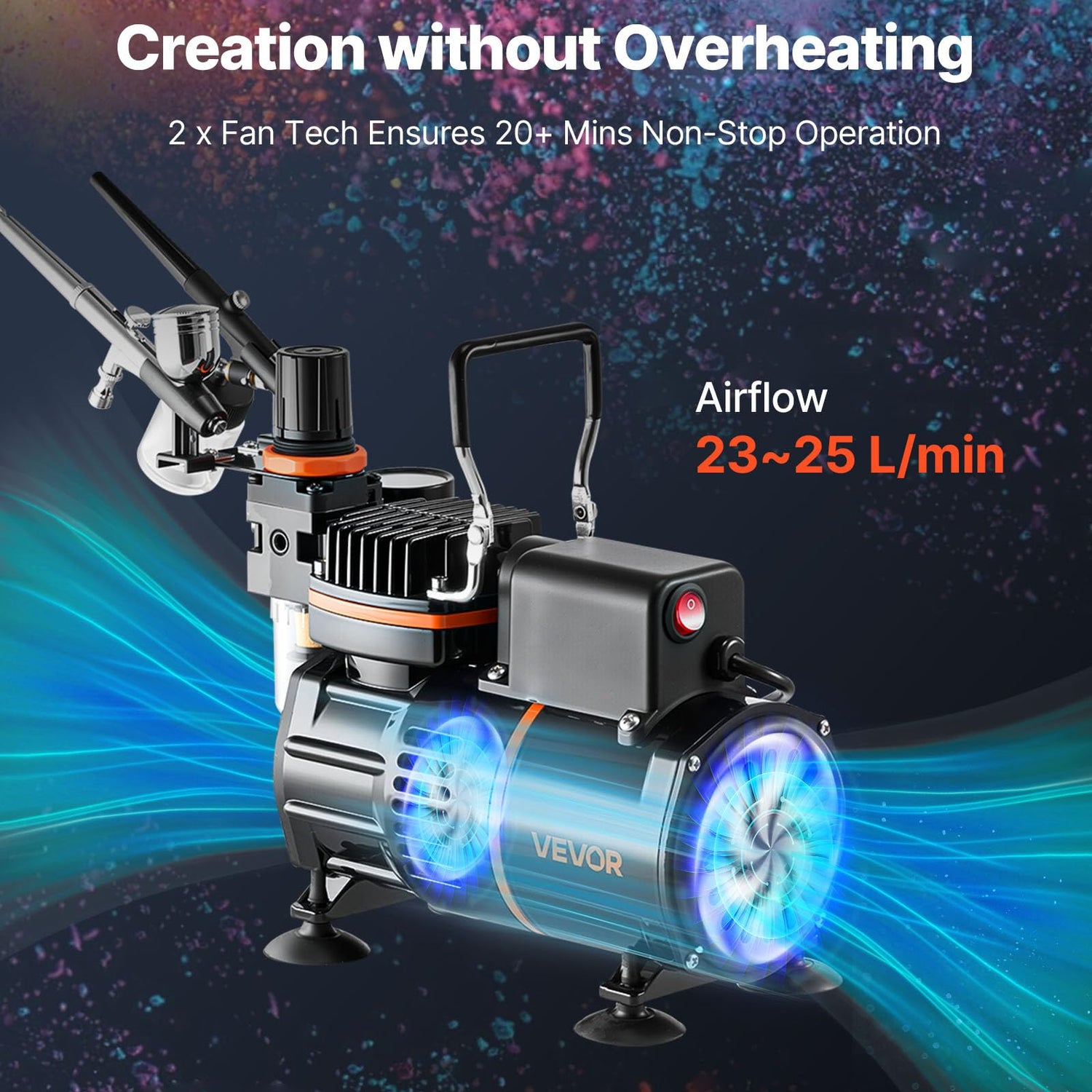 - Overheat-Proof, Long-Lasting Use: The air brush kit with air compressor is built with dual cooling fans to support 20+ minutes of continuous use without overheating. Enjoy consistent airflow (23–25L/min) and smooth operation during large projects
