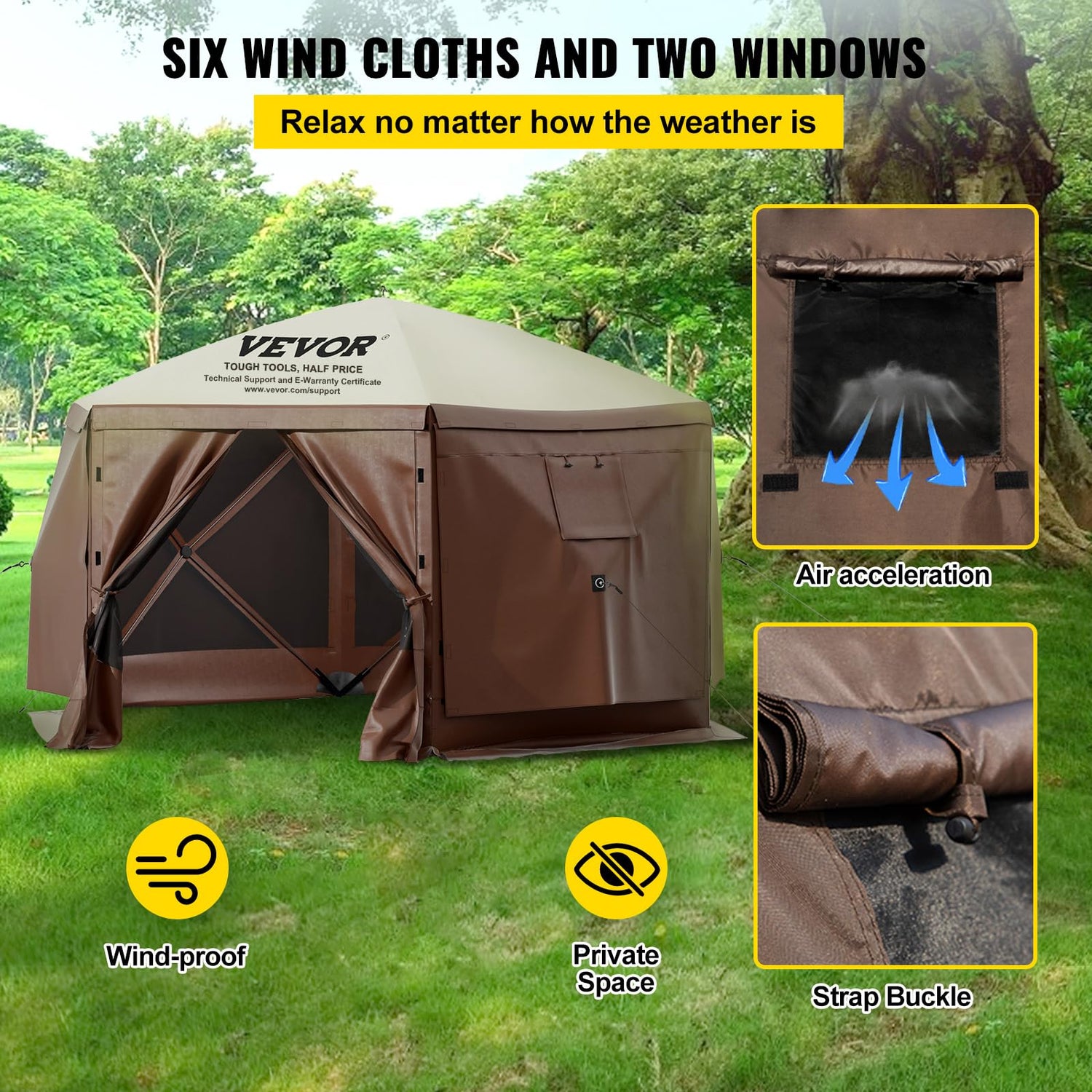 VEVOR Camping Gazebo Screen Tent, 10 * 10ft, 6 Sided Pop-up Canopy Shelter Tent with Mesh Windows, Portable Carry Bag, Stakes, Large Shade Tents for Outdoor Camping, Lawn and Backyard