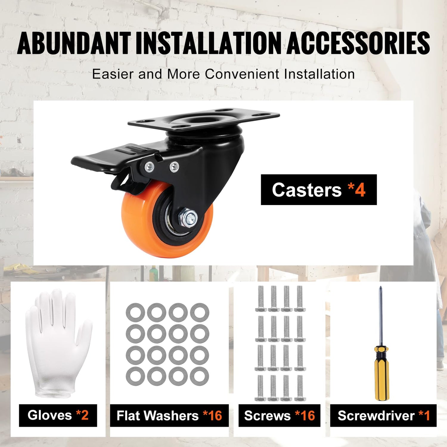 VEVOR Caster Wheels, 2-inch Swivel Plate Casters, Set of 4, with Security Dual Locking No Noise PVC Wheels, Heavy Duty 150 lbs Load Capacity Per Caster, Non-Marking Wheels for Cart Furniture Workbench