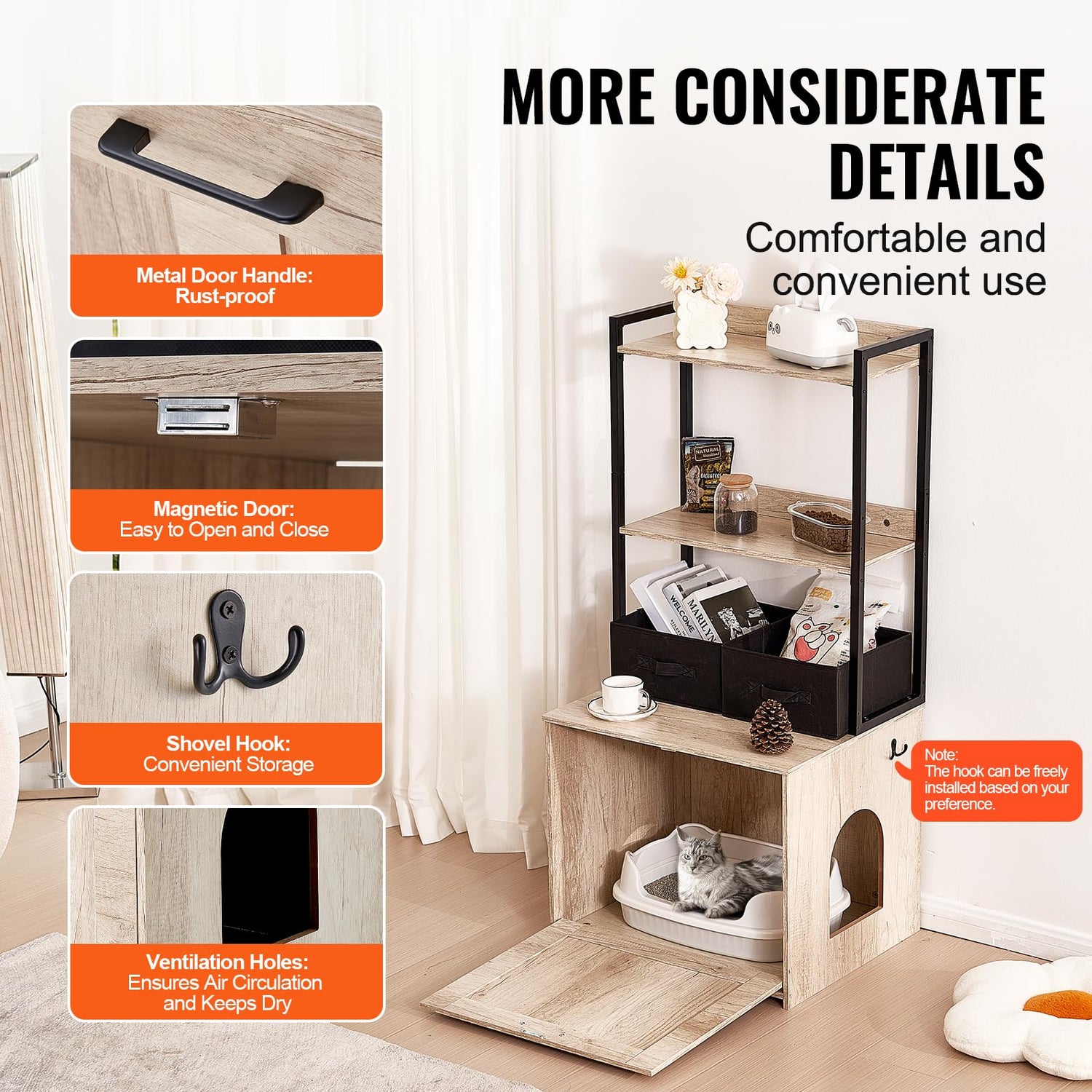 - More Considerate Details: The magnetic door makes this cat box enclosure opening and closing effortless; cat scratching board provides playful entertainment for your pet. A handy shovel hook offers easy storage, and the ventilation holes ensure proper airflow to keep the interior dry, creating a more comfortable and welcoming cat house cabinet. It's designed with reserved space at the shelf support feet, you can choose to assemble at your will. You can choose the place to put in the screws according to the manual.