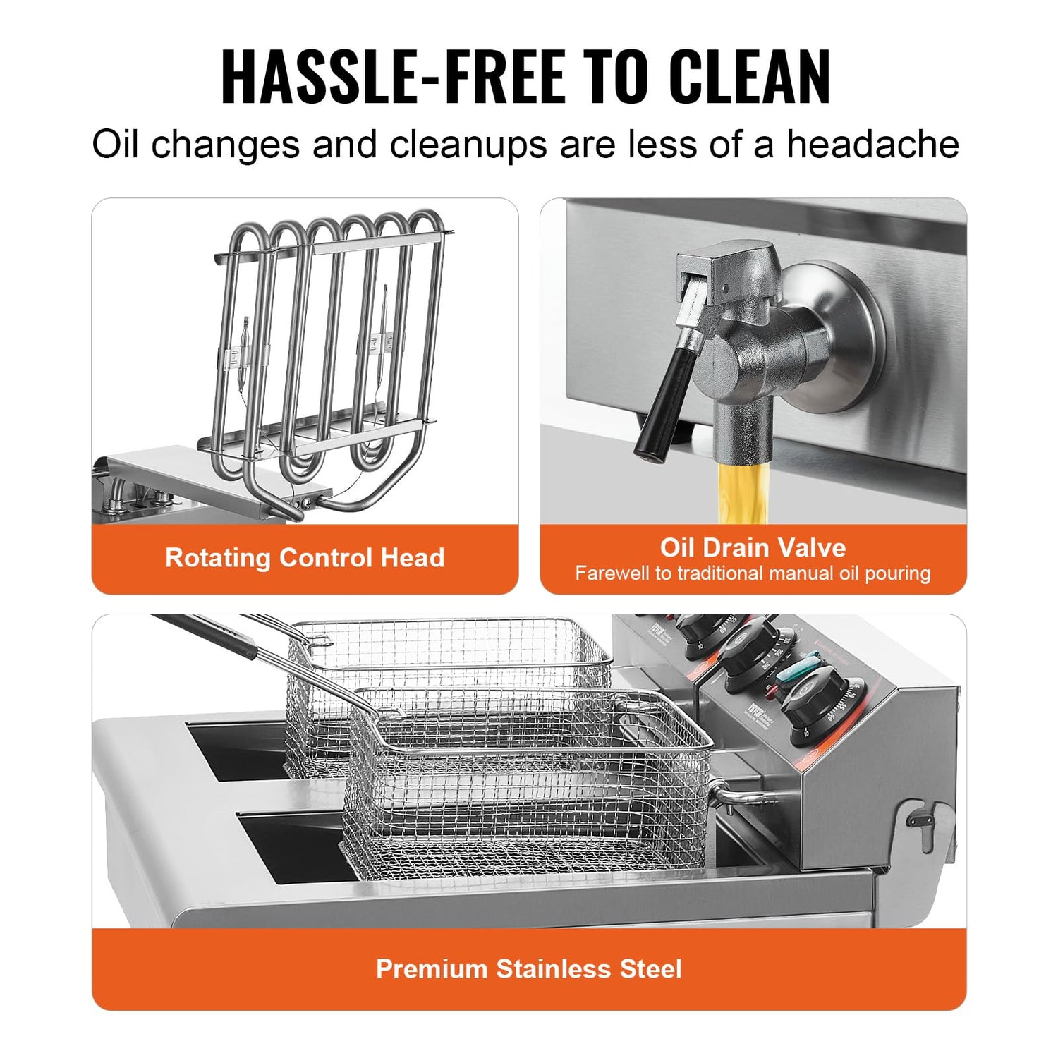 - Clean with Ease: Luckily, its heating tube can be easily flipped up, which facilitates an easier cleaning after every use. The stainless steel exterior makes it easy to wipe down. Also, the tank comes with a front-mounted drain valve for effortless oil release.