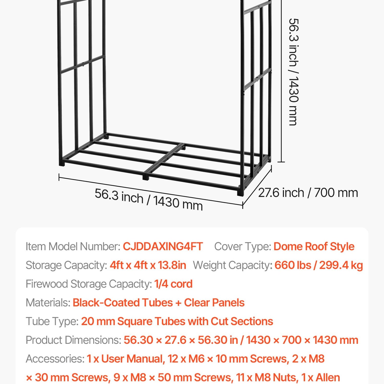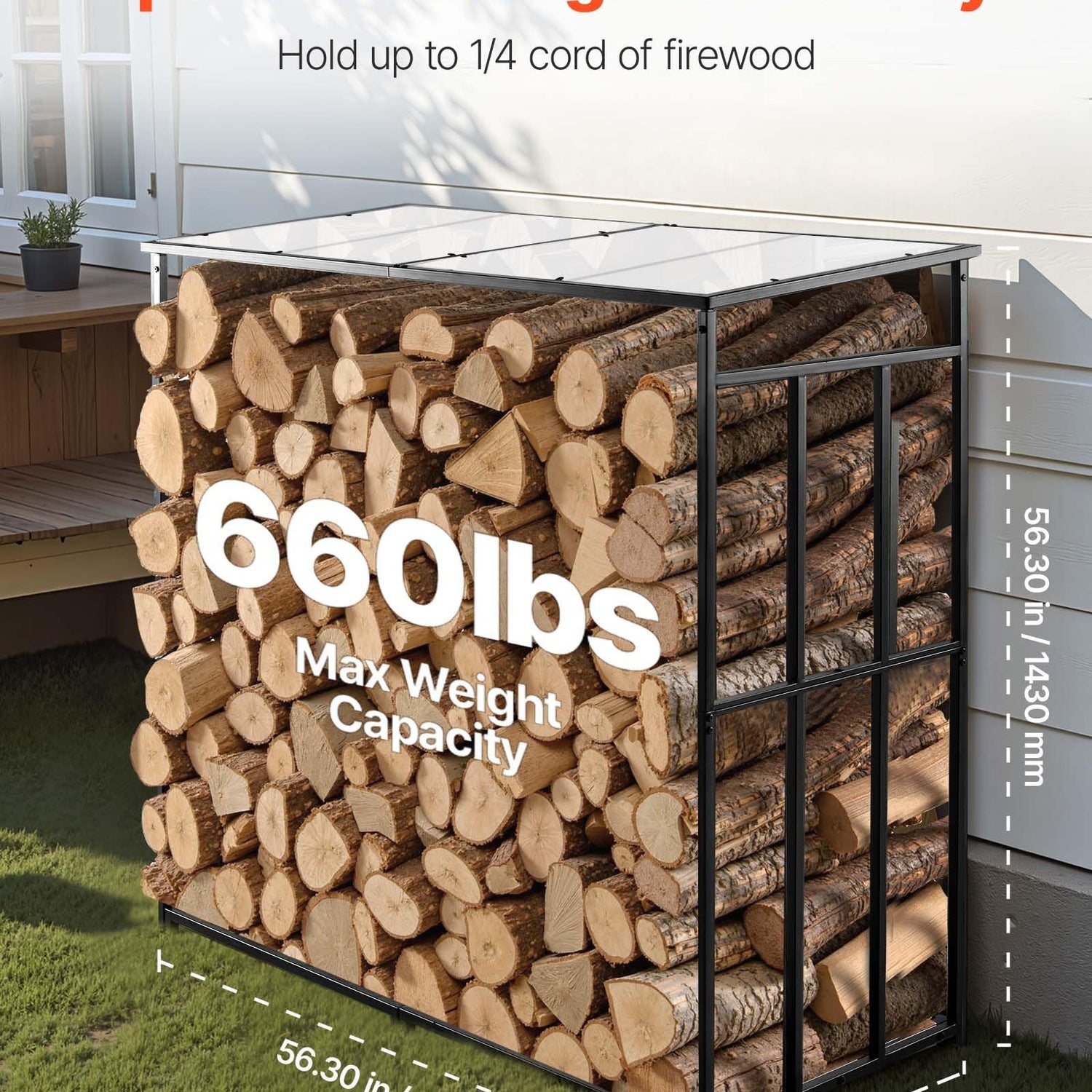 - Spacious Storage Capacity: This firewood rack holds approximately 1/4 cord of wood, providing ample space for home heating needs, backyard fire pits, or camping supplies. Designed for convenience, it keeps logs neatly organized and easy to access.